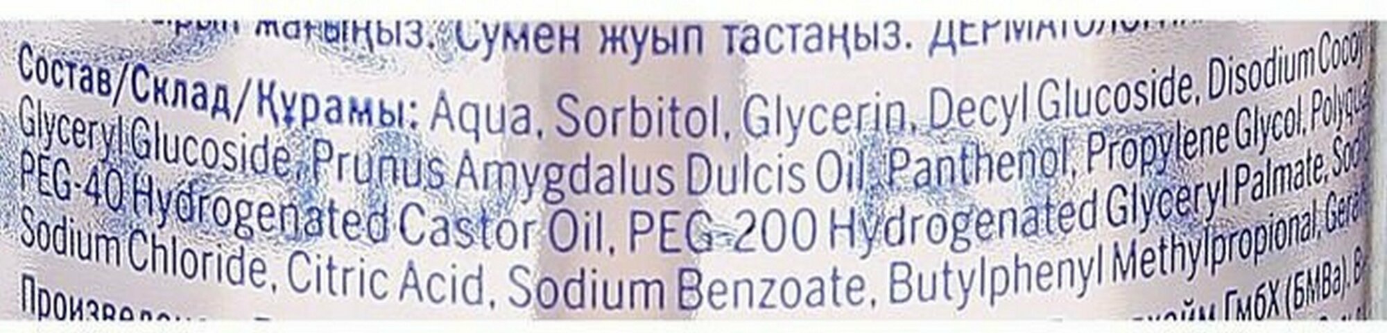 | Состав | Aqua, Sorbitol, Glycerin, Decyl Glucoside, Disodium Cocoyl Glutamate, Glyceryl Glucoside, Prunus Amygdalus Dulcis Oil, Panthenol, Propylene Glycol, Polyquaternium-10, PEG-40 Hydrogenated Castor Oil, PEG-200 Hydrogenated Glyceryl Palmate, Sodium Sulfate, Sodium Chloride, Citric Acid, Sodium Benzoate, Butylphenyl Methylpropional, Geraniol, Parfum |