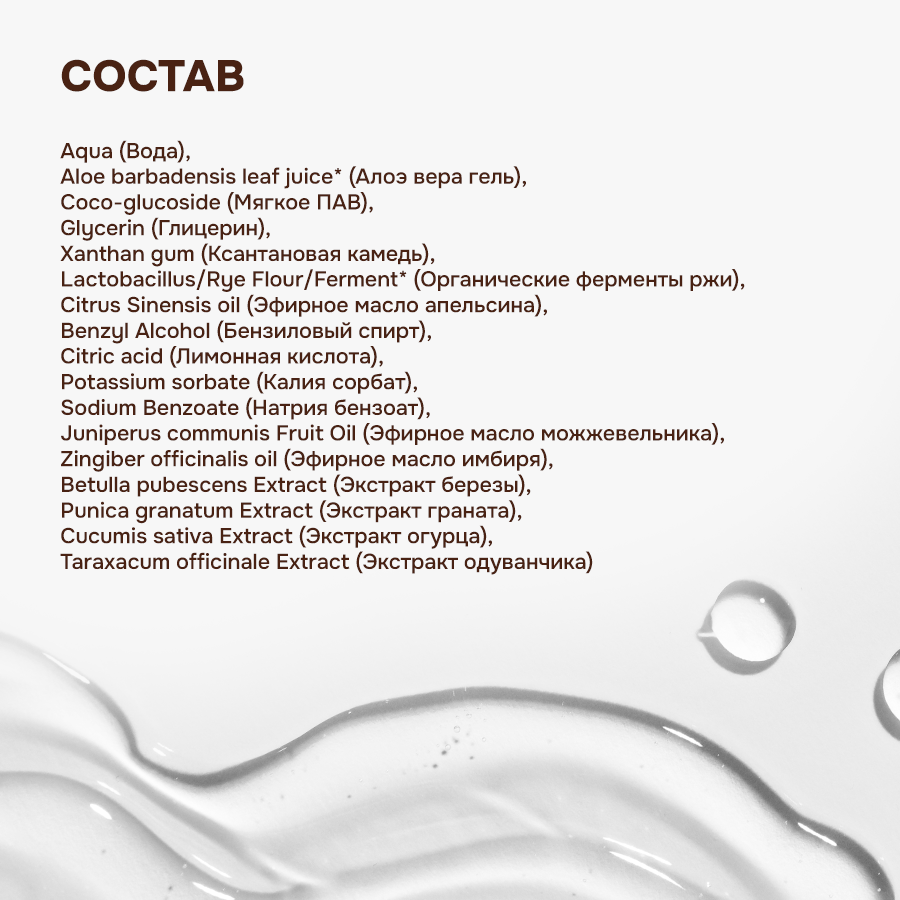 | Состав | Aqua (Вода), Aloe barbadensis leaf juice* (Алоэ вера гель), Coco-glucoside (Мягкое ПАВ), Glycerin (Глицерин), Xanthan gum (Ксантановая камедь), Lactobacillus/Rye Flour/Ferment* (Органические ферменты ржи), Citrus Sinensis oil (Эфирное масло апельсина), Benzyl Alcohol (Бензиловый спирт), Citric acid (Лимонная кислота), Potassium sorbate (Калия сорбат), Sodium Benzoate (Натрия бензоат), Juniperus communis Fruit Oil (Эфирное масло можжевельника), Zingiber officinalis oil (Эфирное масло имбиря), Betulla pubescens Extract (Экстракт березы), Punica granatum Extract (Экстракт граната), Cucumis sativa Extract (Экстракт огурца), Taraxacum officinale Extract (Экстракт одуванчика). 99.7% - от общего количества ингредиенты натурального происхождения. |