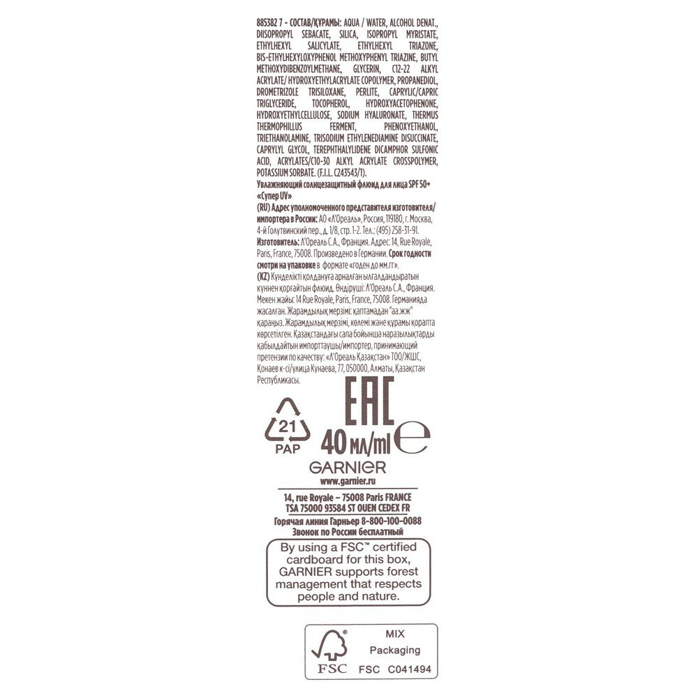 Garnier Увлажняющий солнцезащитный флюид для лица Super UV SPF50+ с гиалуроновой кислотой Amber solaire, 40 мл
