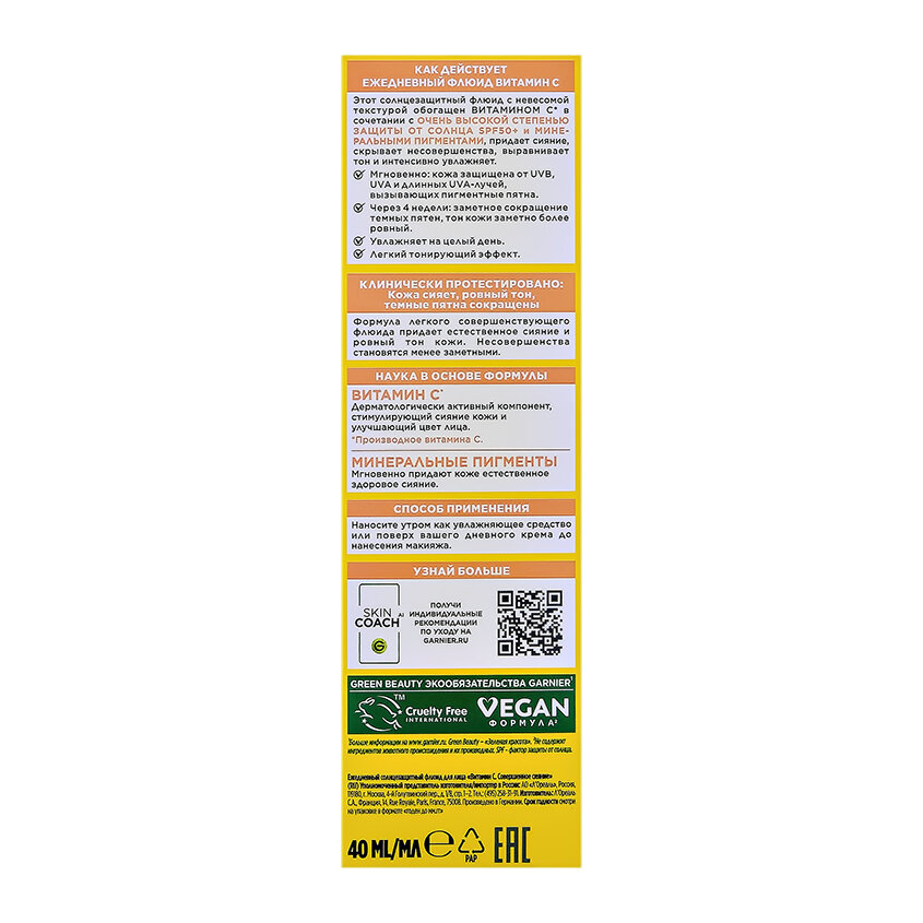 Флюид для лица `GARNIER` с витамином С, Совершенное сияние SPF50+, 40 мл