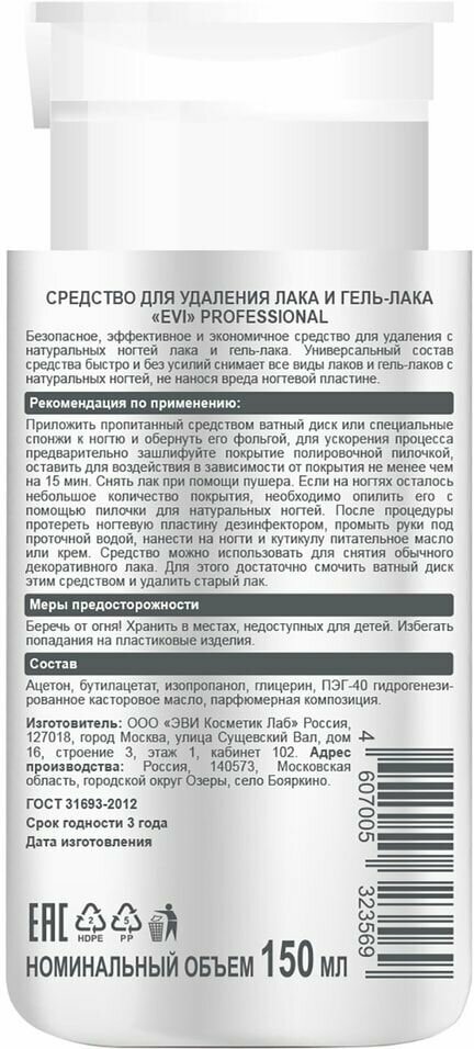 Средство для удаления лака и гель-лака с помпой-дозатором EVI Professional 150 мл