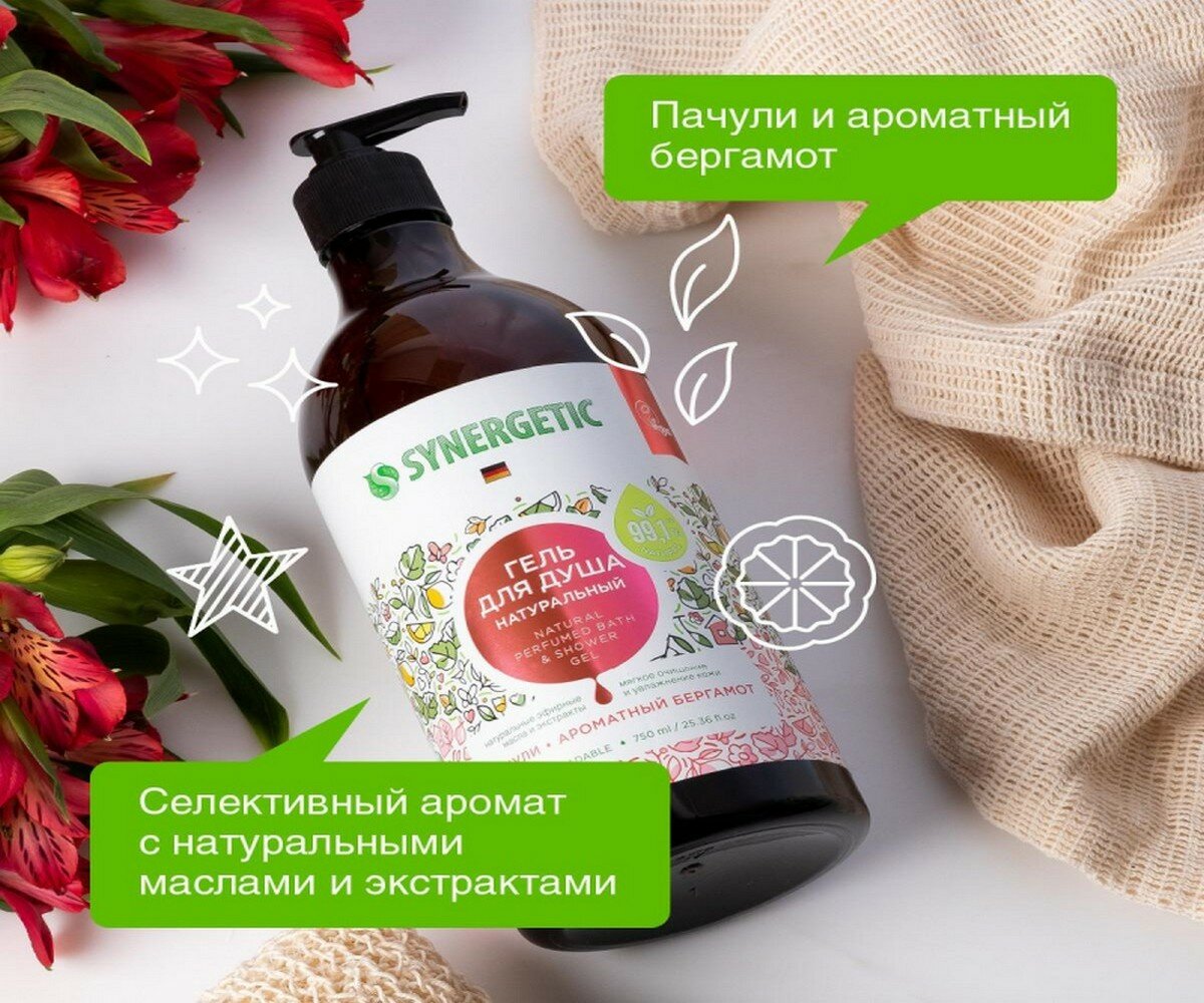 СохранитьГель для душа SYNERGETIC "Пачули и ароматный бергамот" увлажняющий, натуральный, 750мл интересное: