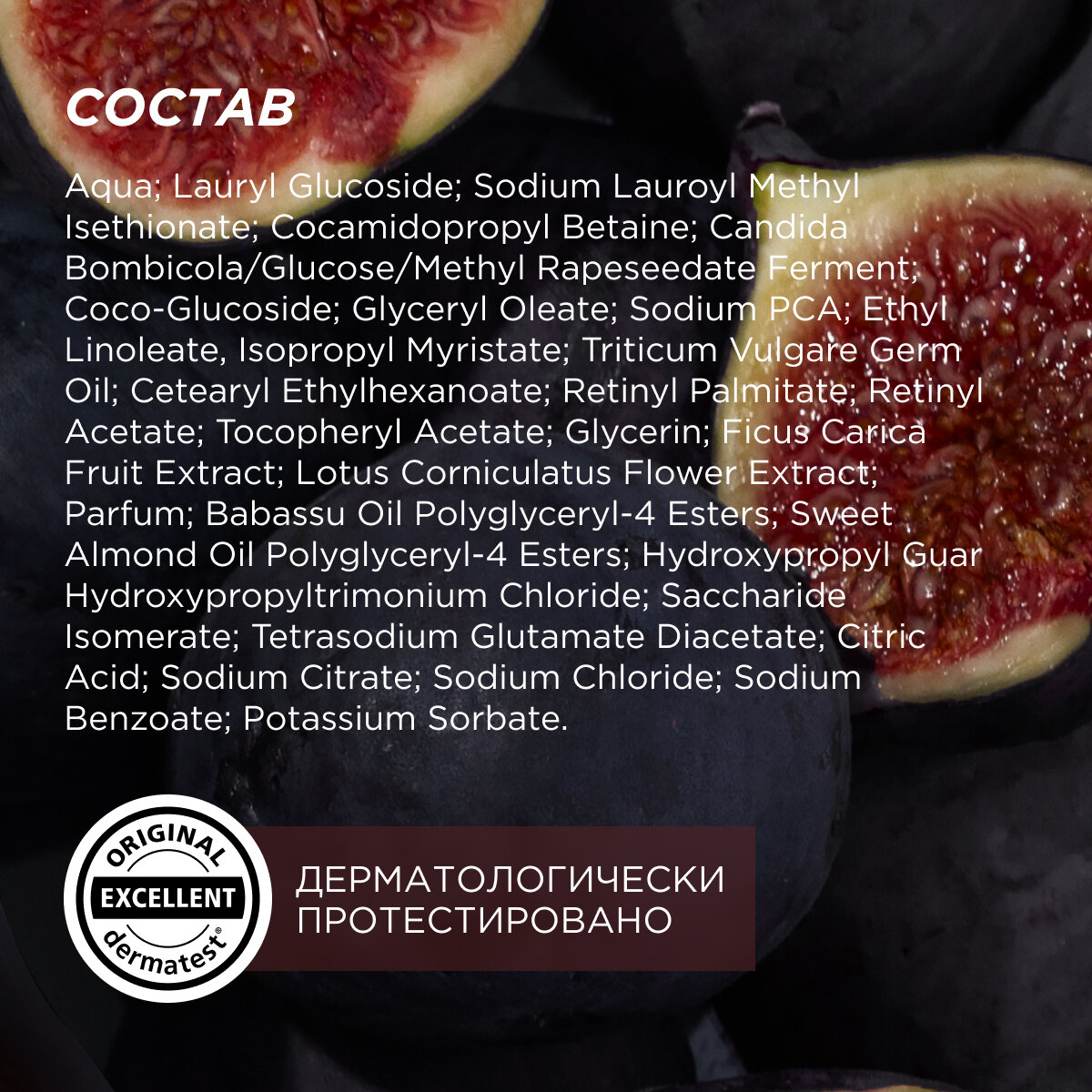 | Состав | aqua; lauryl glucoside; cocamidopropyl betaine; sodium lauroyl methyl isethionate; rapeseed sophorolipids; lauroyl / myristoyl methyl glucamide; coco glucoside; glyceryl oleate; sodium pca; ethyl linoleate; isopropyl myristate; triticum vulgare germ oil; cetearyl ethylhexanoate; retinyl palmitate; retinyl acetate; tocopheryl acetate; parfum; babassu oil polyglyceryl-4 esters; sweet almond oil polyglyceryl-4 esters; hydroxypropyl guar hydroxypropyltrimonium chloride; saccharide isomerate; tetrasodium glutamate diacetate; glycerin; ficus carica (fig) fruit extract; butylene glycol; nelumbo nucifera flower extract; sodium citrate; sodium benzoate |