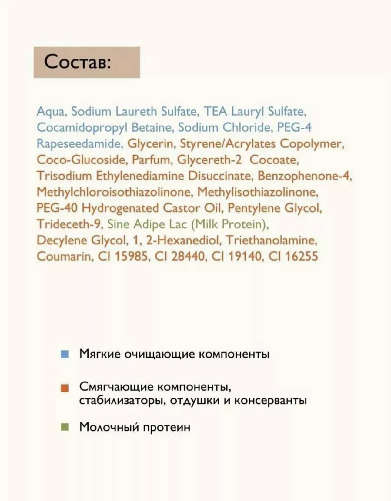 | Состав | Aqua, Sodium Laureth Sulfate, TEA Lauryl Sulfate, Cocamidopropyl Betaine, Sodium Chloride, PEG-4 Rapeseedamide, Glycerin, Styrene/Acrylates Copolymer, Glycereth-2 Cocoate, Trisodium Ethylenediamine Disuccinate, Parfum, Benzophenone-4, Musa Acuminata (Banana) Extract |