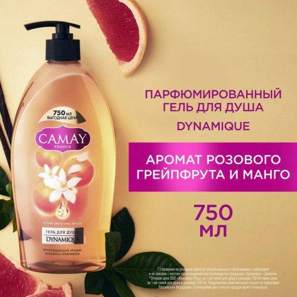 Гель для душа женский парфюмированный CAMAY Динамик с ароматом розового грейпфрута для всех типов кожи 750 мл