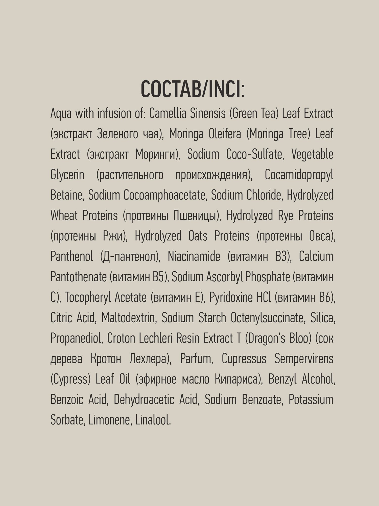 | Состав | Aqua, Sodium Coco-Sulfate, Cocamidopropyl Betaine, Glycerin (глицерин растительного происхождения), Camellia Sinensis Leaf Extract (экстракт зеленого чая), Moringa Oleifera Leaf Extract (экстракт моринги), Sodium Cocoamphoacetate, Sodium Chloride, Hydrolyzed Wheat Protein (протеины пшеницы), Hydrolyzed Rye Protein (протеины ржи), Hydrolyzed Oat Protein (протеины овса), Panthenol (провитамин В5), Niacinamide (витамин В3), Calcium Pantothenate (витамин В5), Sodium Ascorbyl Phosphate (витамин С), Tocopheryl Acetate (витамин Е), Pyridoxine HCl (витамин В6), Maltodextrin, Sodium Starch Octenylsuccinate, Silica, Propanediol, Croton Lechleri Resin Extract (Dragon's Blood, сок дерева Кротон Лехлера), Cupressus Sempervirens Leaf Oil (эфирное масло кипариса), Citric Acid, Benzyl Alcohol, Sodium Benzoate, Potassium Sorbate, Parfum, Limonene, Linalool. |