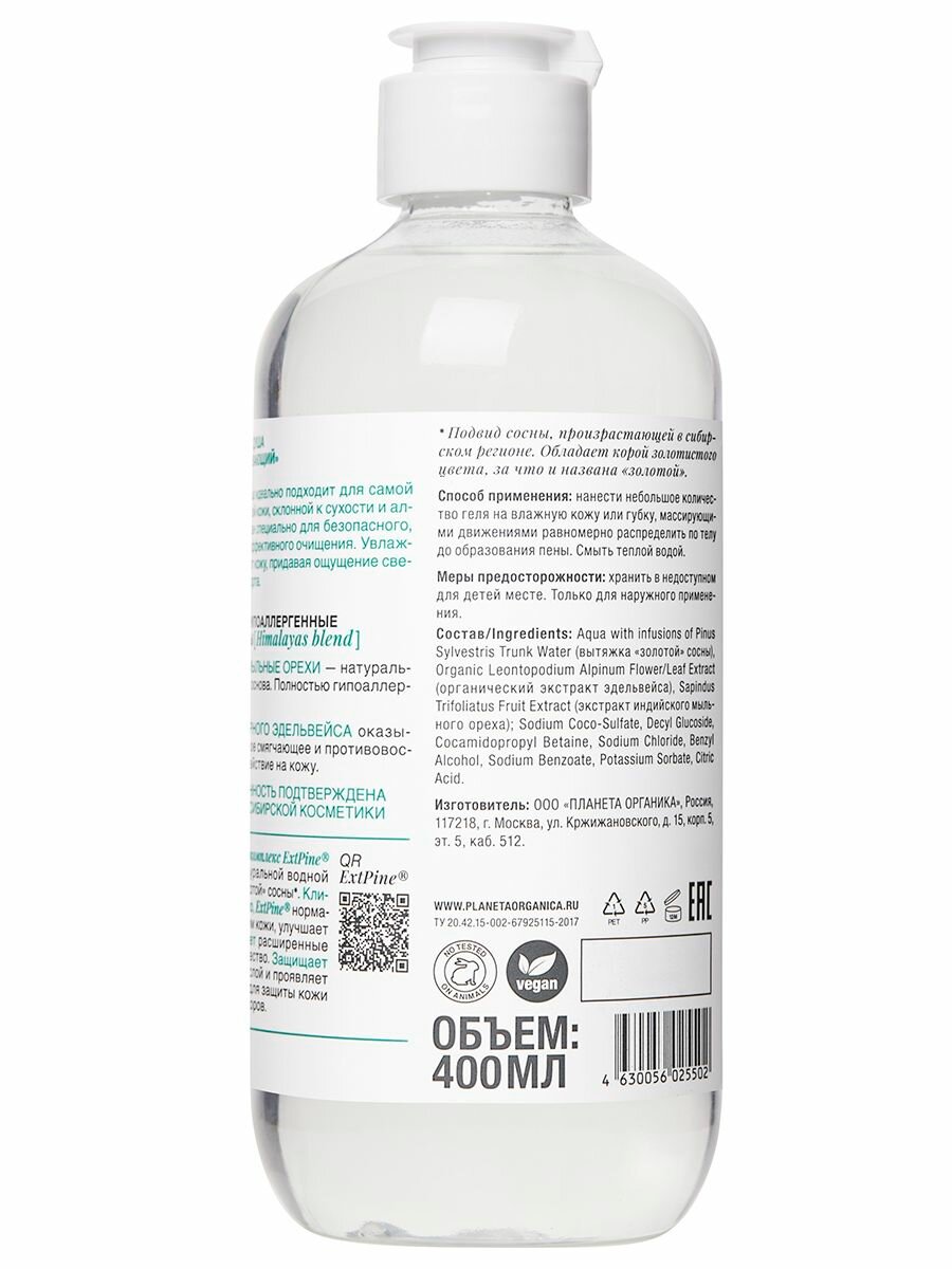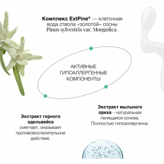 | Состав | Aqua with infusions of Pinus Sylvestris Trunk Water (вытяжка «золотой» сосны); Organic Leontopodium Alpinum Flower/Leaf Extract(органический экстракт эдельвейса), Sapindus Trifoliatus Fruit Extract(экстракт индийского мыльного ореха), Sodium Coco-Sulfate, Decyl Glucoside, Cocamidopropyl Betaine, Sodium Chloride,Benzyl Alcohol, Sodium Benzoate, Potassium Sorbate, Citric Acid |