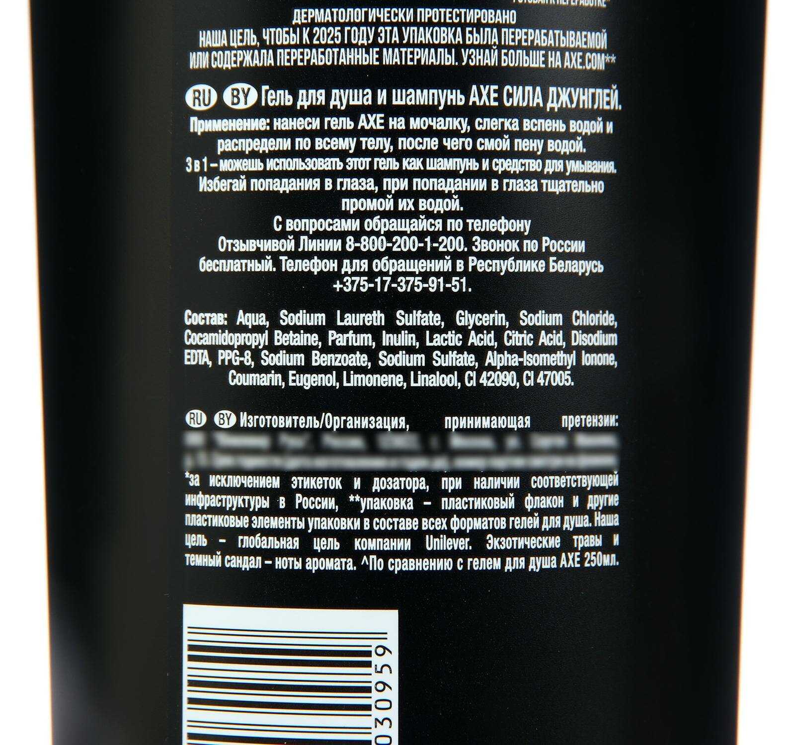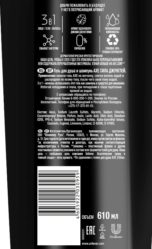 | Способ применения | нанеси гель AXE на мочалку, слегка вспень водой и распредели по всему телу, после чего смой пену водой. 3 в 1 можешь использовать этот гель как шампунь и средство для умывания. Избегай попадания в глаза, при попадании в глаза тщательно промой их водой |