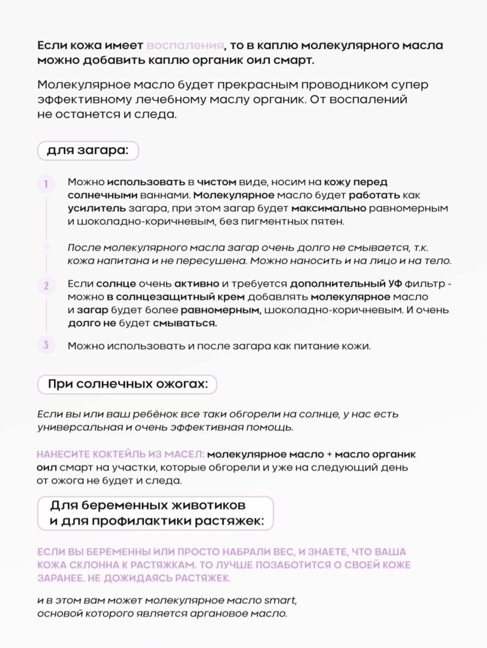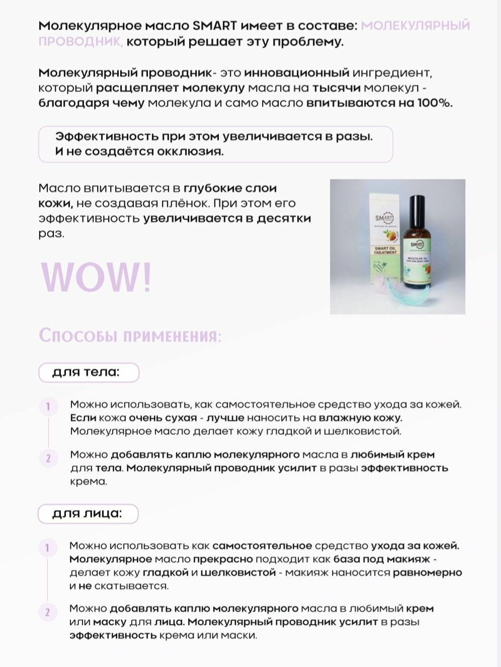 | Способ применения | Нанесите на не влажную, чистую кожу легкими, массирующими движениями. В случае сухости кожи - добавить каплю воды в каплю молекулярного смарт масла. |