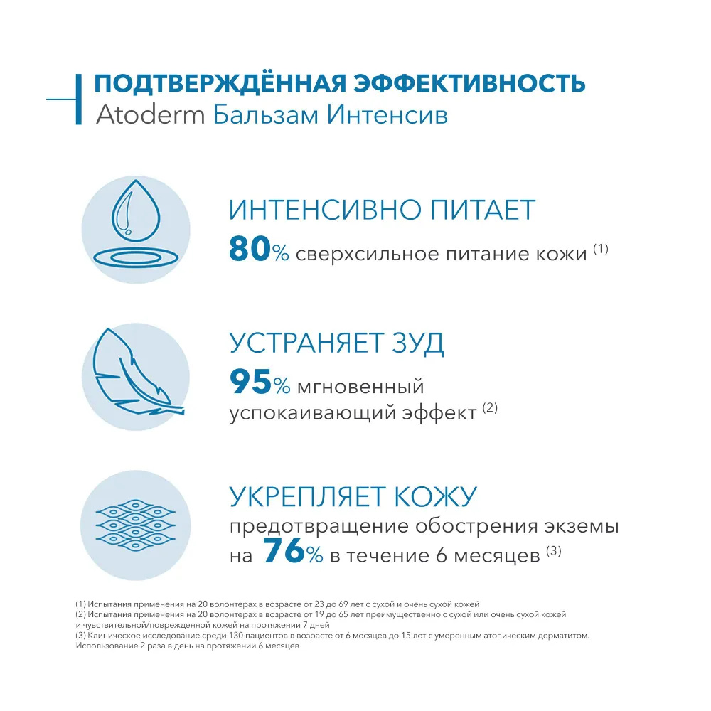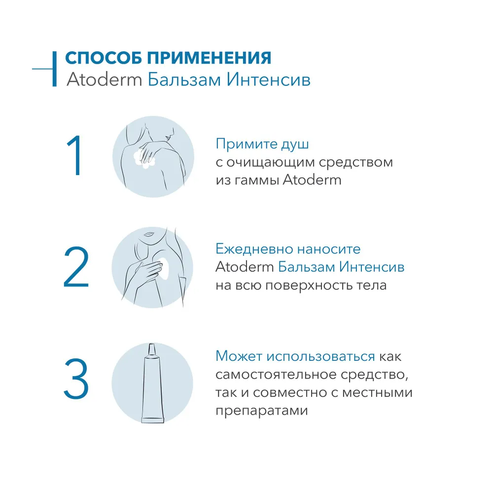 | Способ применения | один или два раза в день-7 дней в неделю, можно применять ежедневно, нанесите Atoderm Intensive Baume на лицо и/или тело после очищения и легкой сушки |