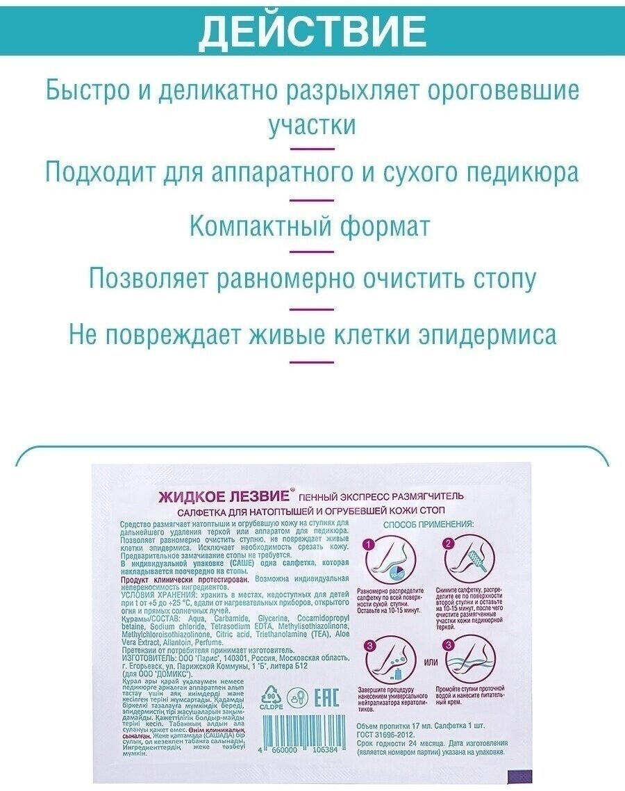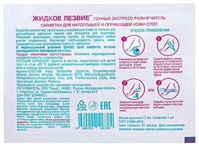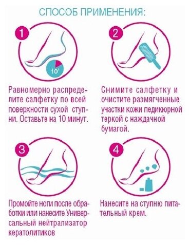 | Способ применения | равномерно распределите салфетку по всей поверхности сухой ступни. Оставьте на 10 минут. Снимите салфетку и очистите размягченные участки кожи педикюрной теркой с наждачной бумагой. Промойте ноги после обработки или нанесите универсальный нейтрализатор кератолитиков. Нанесите на ступню питательный крем |
