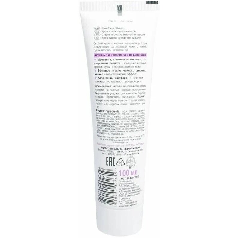 | Способ применения | небольшое количество крема нанести на чистые, хорошо высушенные загрубевшие участки кожи и мозоли. Хорошо втереть. Применять ежедневно. Размягченную кожу через несколько дней удалить пемзой или скрабом после ванночки для ног |