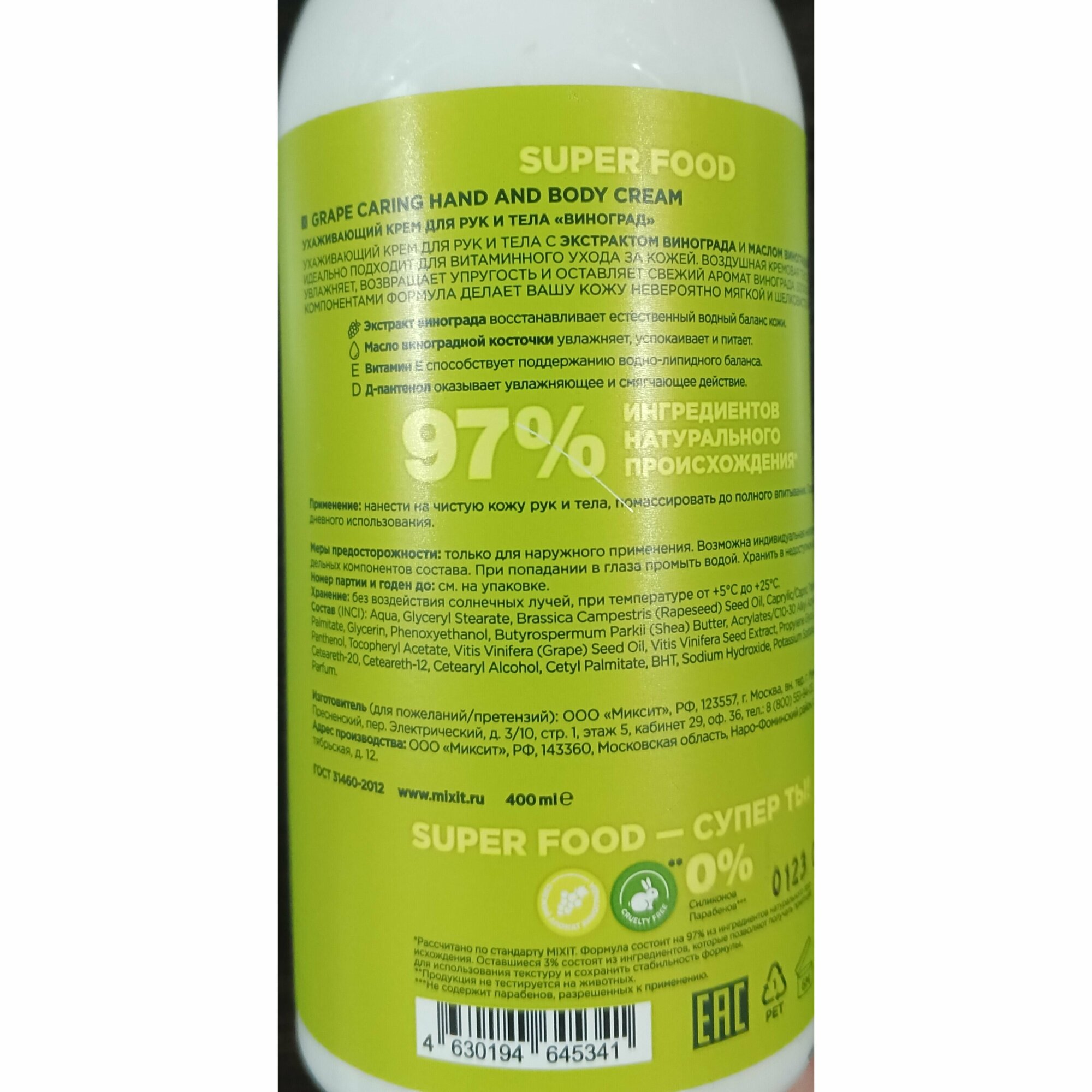 Mixit Super Food Ухаживающий крем для рук и тела с экстрактом винограда 400 мл 1 шт