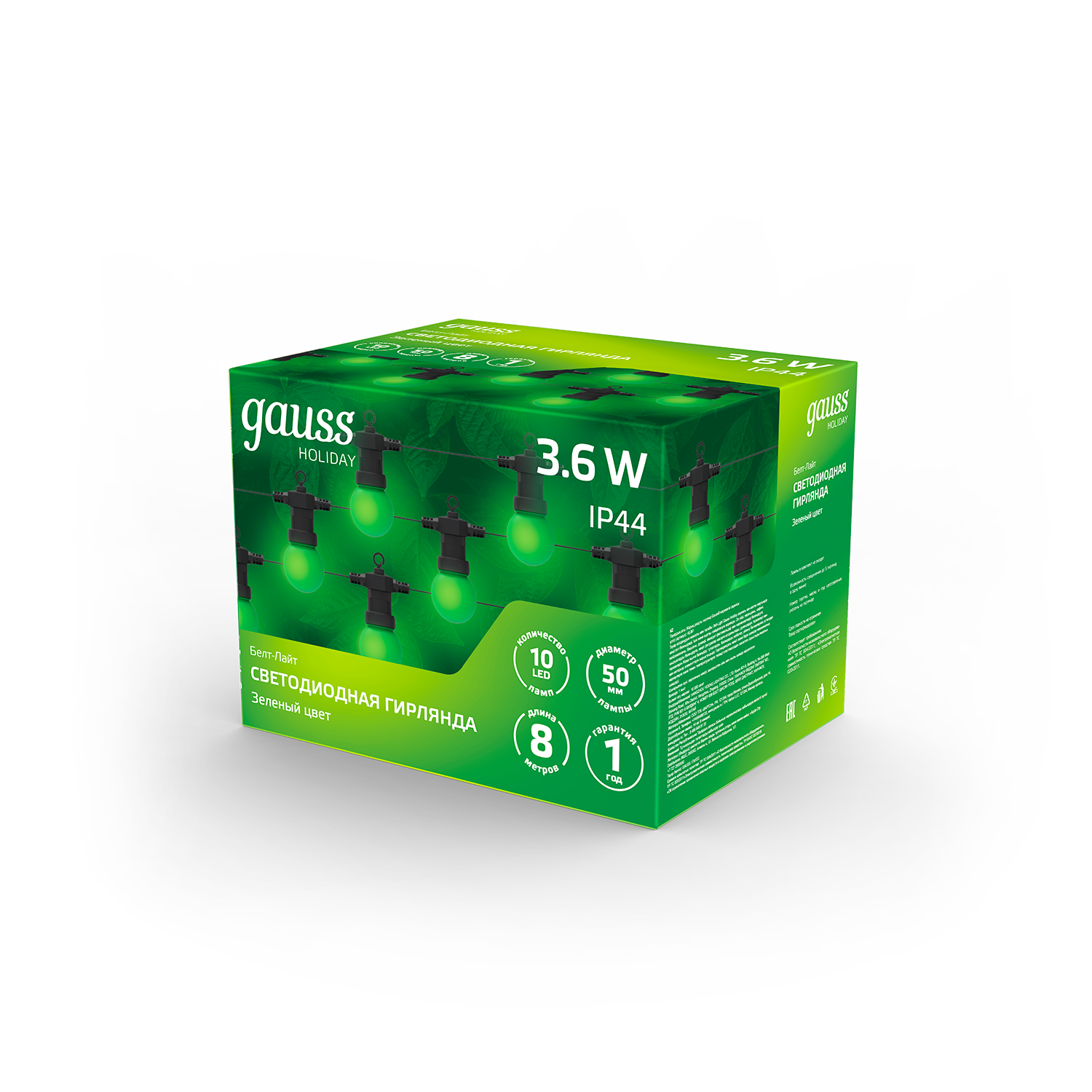 Светодиодная гирлянда Gauss Белт Лайт серия Holiday, 10 ламп, 7,7 м, IP44, зеленый, 1/6