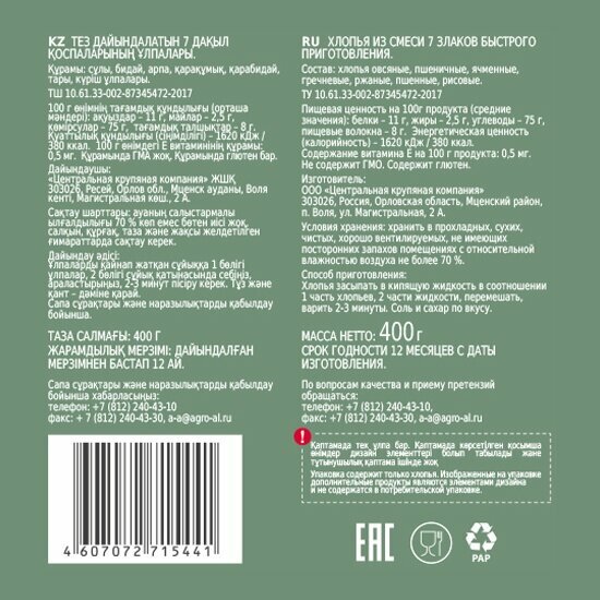 | Состав | хлопья овсяные, пшеничные, ячменные, гречневые, ржаные, пшенные, рисовые |