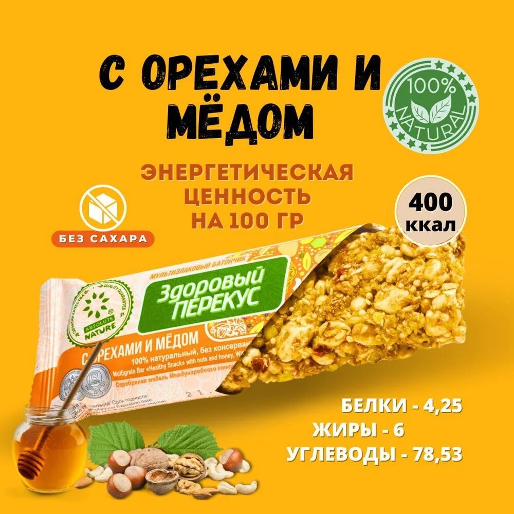 Злаковый батончик Absolute NATURE Здоровый перекус с орехами и мёдом 60 г интересное: