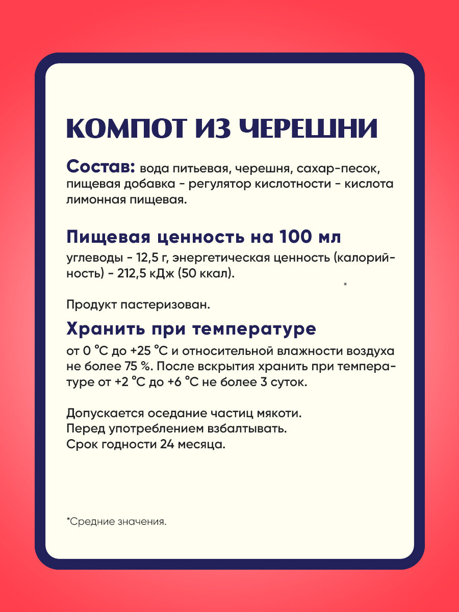 | Состав | Вода питьевая, абрикос, вишня, сахар-песок, пищевая добавка - регулятор кислотности - кислота лимонная пищевая. |