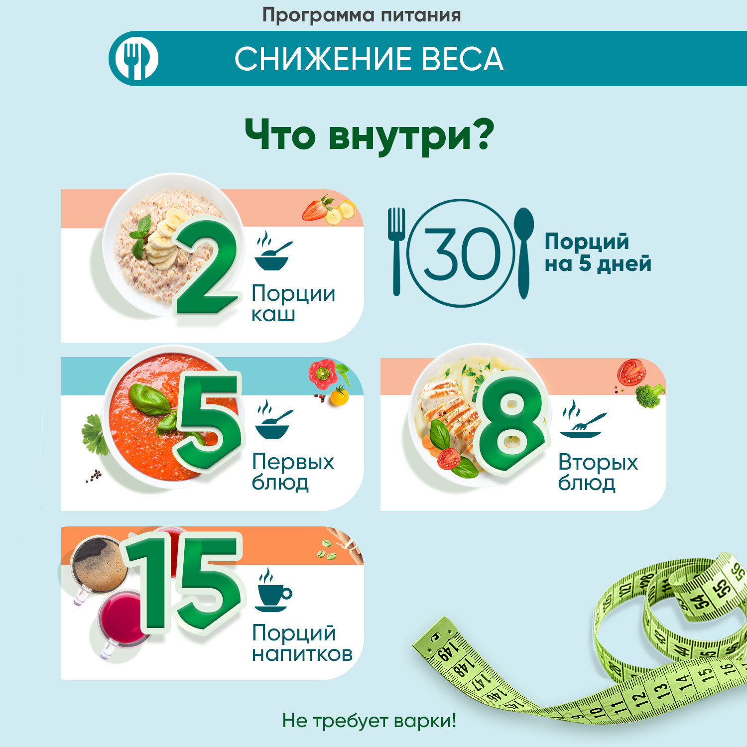 | Дополнительная информация | низкокалорийная программа питания на 5 дней; снижает вес в среднем до 4,7 кг за 2 недели; нормализует работу желудочно-кишечного тракта, выводит из организма продукты обмена; ускоряет обмен веществ |