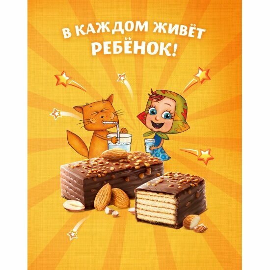 | Состав | кондитерская глазурь (сахар, заменитель масла какао (растительные масла, в том числе соевое, эмульгаторы: Е492, лецитин подсолнечника), какао-порошок, эмульгаторы: лецитин соевый, Е476; ароматизатор), вафли листовые (вода питьевая, мука пшеничная общего назначения, меланж сухой яичный, эмульгатор лецитин соевый, соль, разрыхлитель гидрокарбонат натрия), сахар, масло кокосовое рафинированное дезодорированное, сухая молочная сыворотка, ядро ореха миндаля обжаренное дробленое в сахаре (ядро ореха миндаля, сахар), жир кондитерский (растительные масла, антиокислители: токоферолы, концентрат смеси, лимонная кислота), какао-порошок, соль, ароматизаторы: «Миндальный крем», «Карамель»; комплексная пищевая добавка (антиокислители: аскорбиновая кислота, альфа-Токоферол), эмульгатор лецитин соевый |