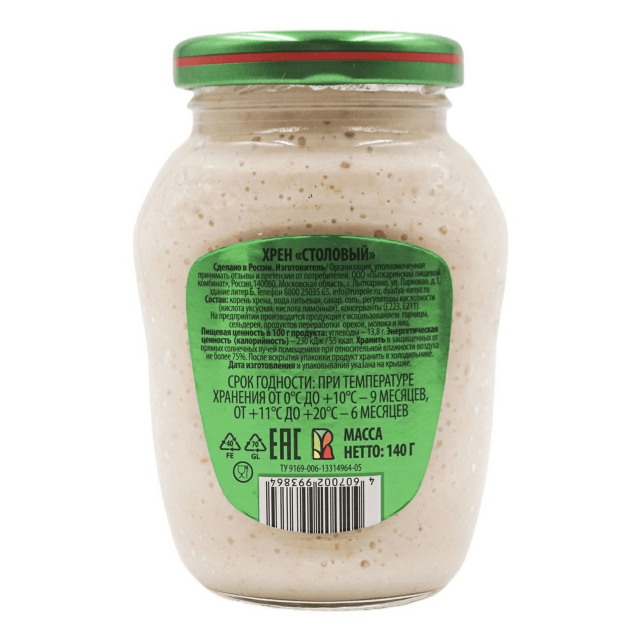 | Состав | корень хрена, вода питьевая, сахар, соль, регуляторы кислотности (кислота уксусная, кислота лимонная), консерванты (Е223, Е211). |