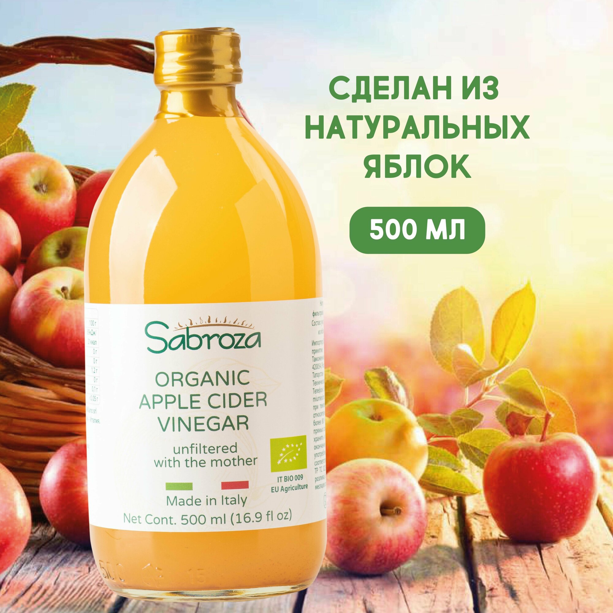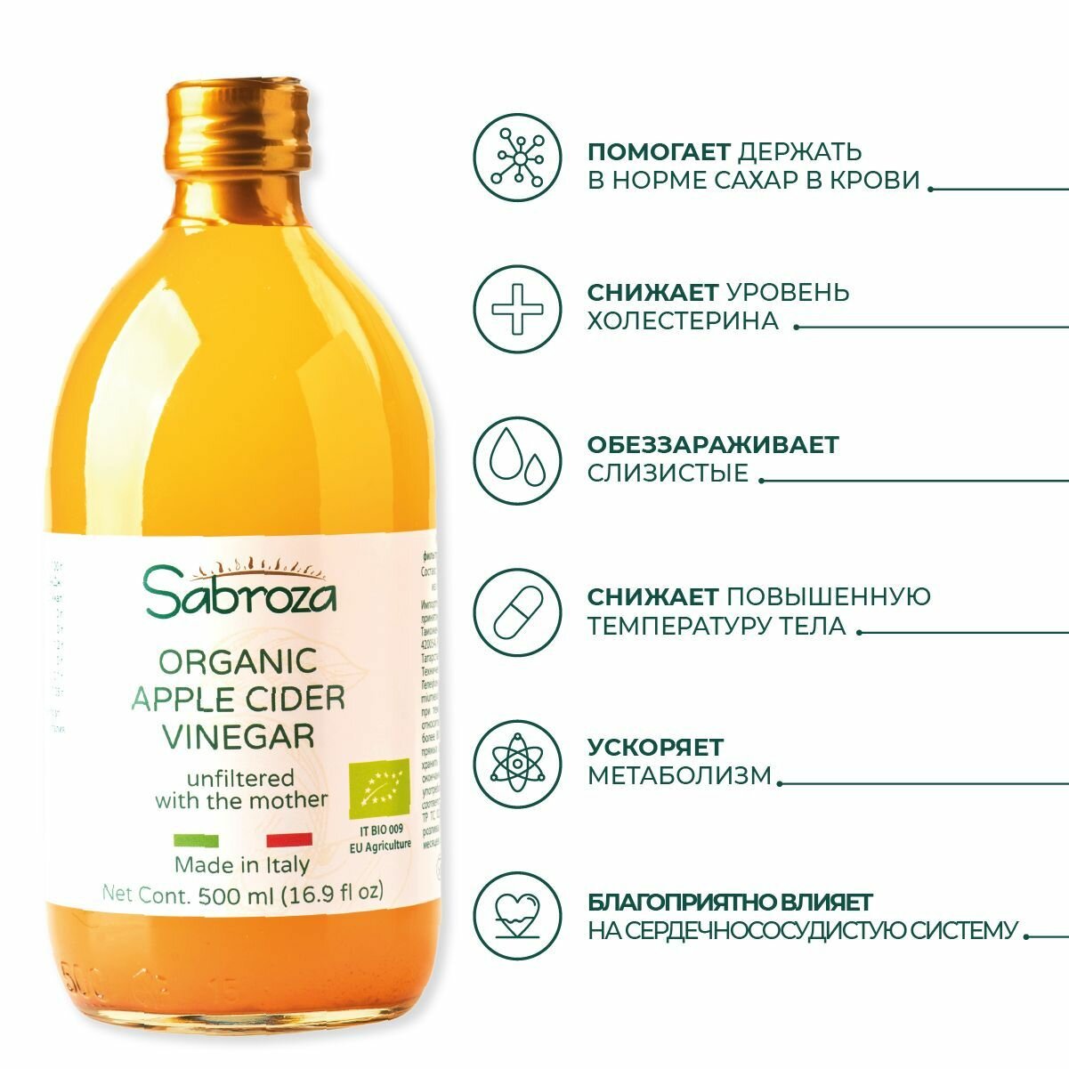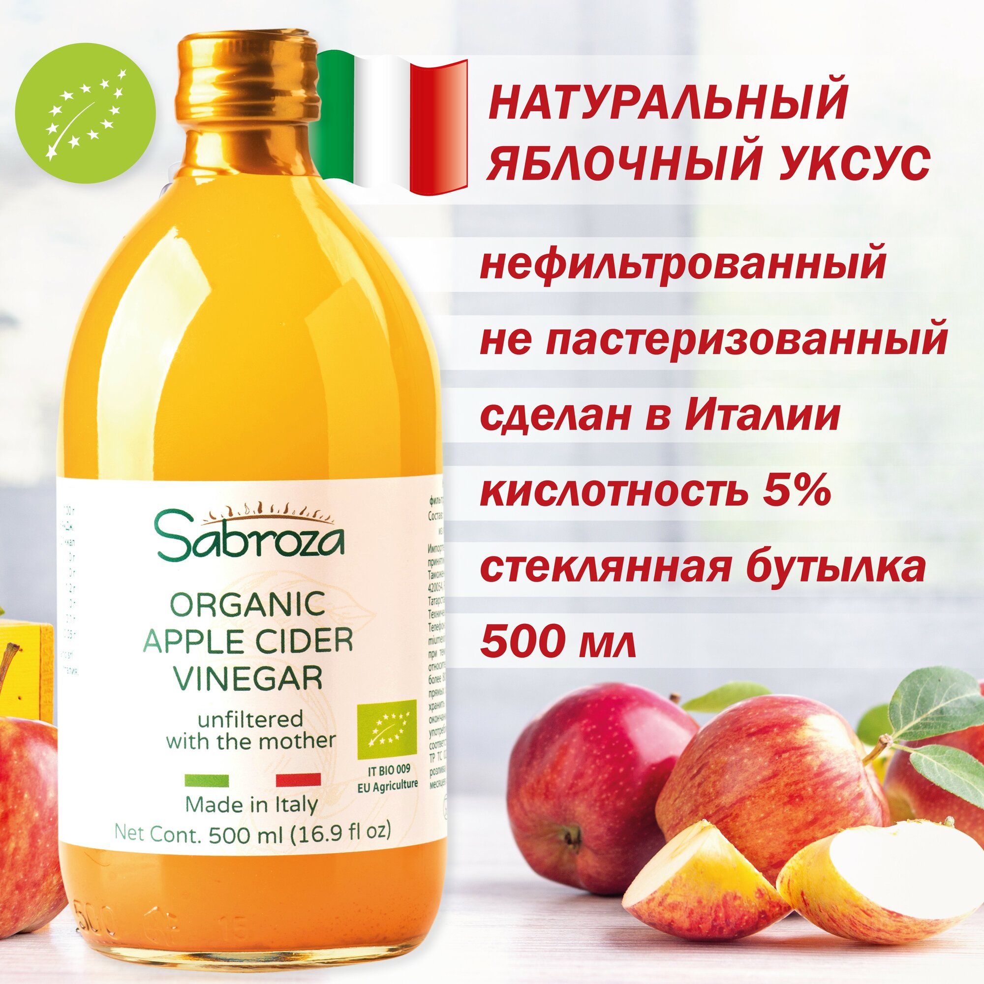 Яблочный уксус 500 мл, натуральный, нефильтрованный, не пастеризованный, c уксусной маткой, в стекле Sabroza