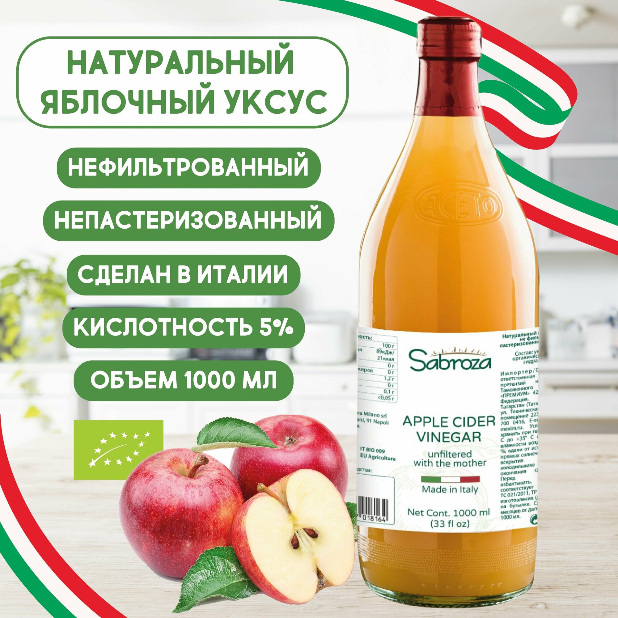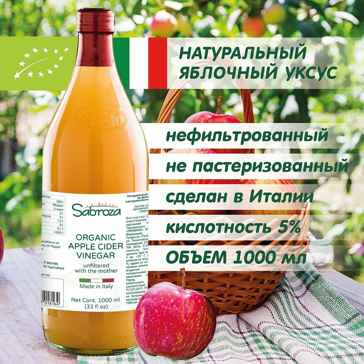 1 литр, Яблочный Уксус Натуральный Нефильтрованный, Непастеризованный, из Италии, Sabroza, c уксусной маткой, ПЭТ бутылка