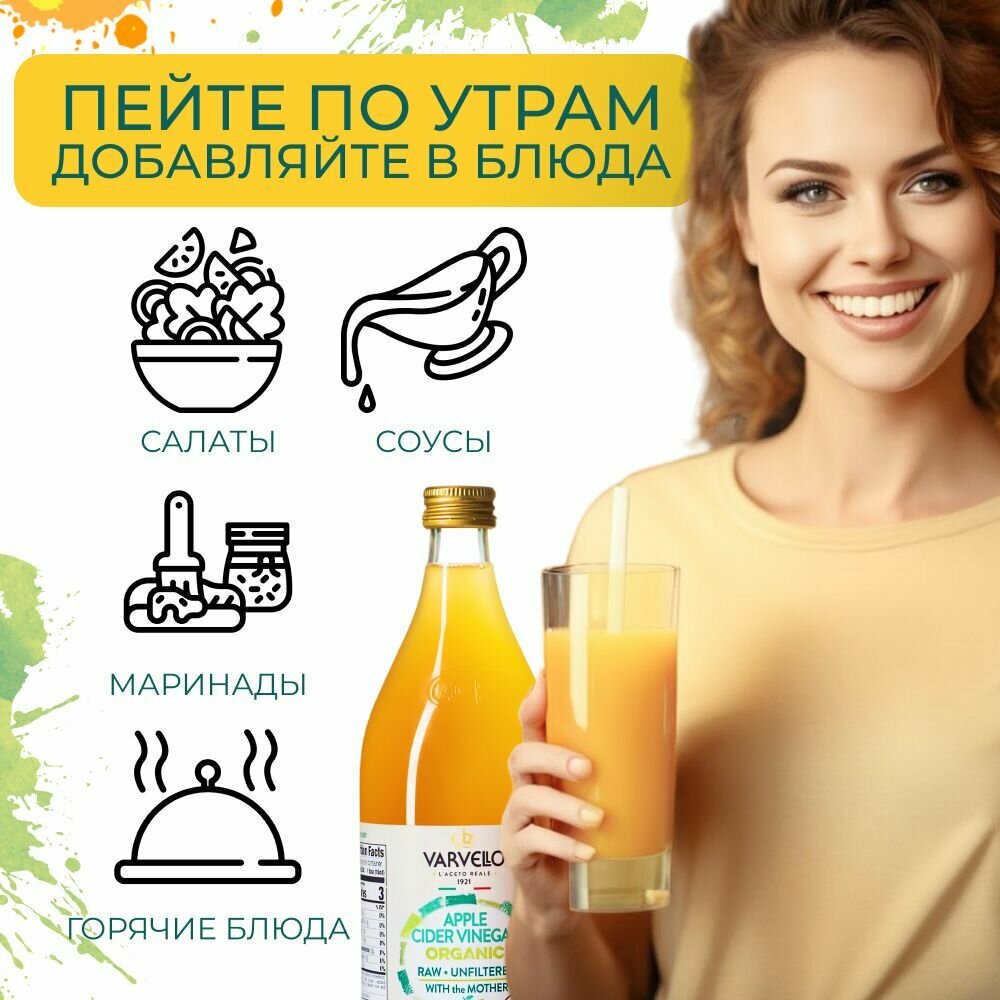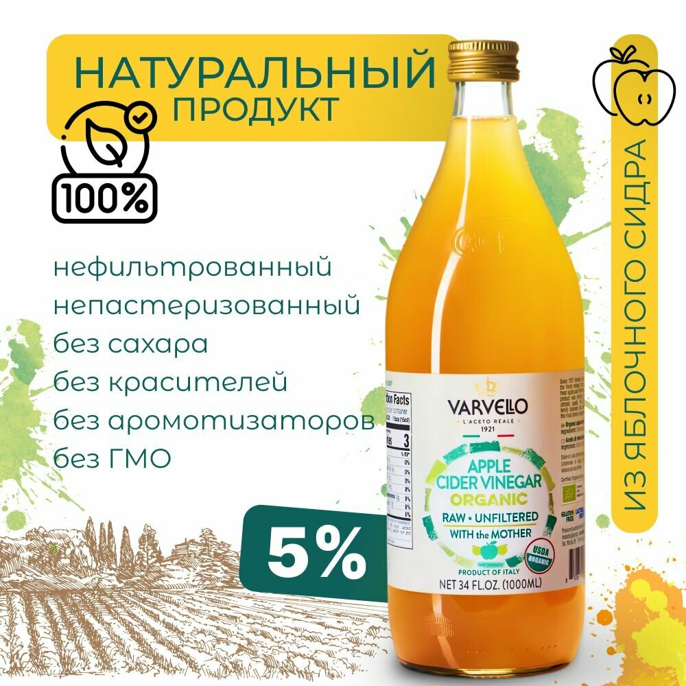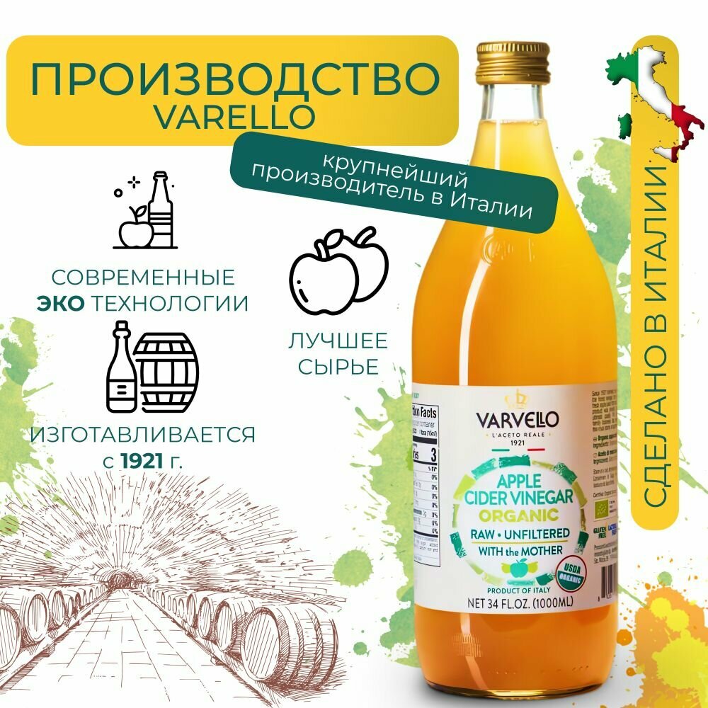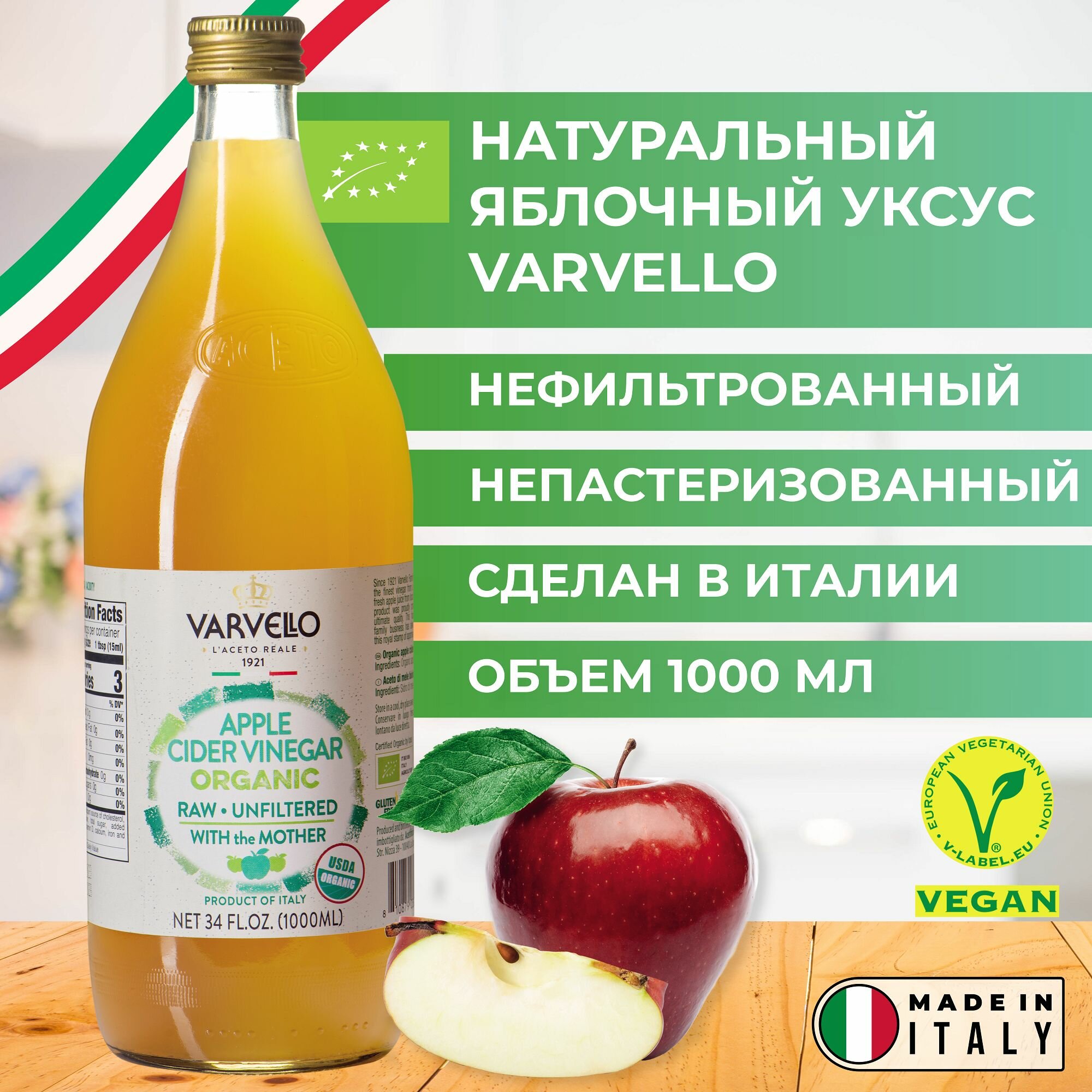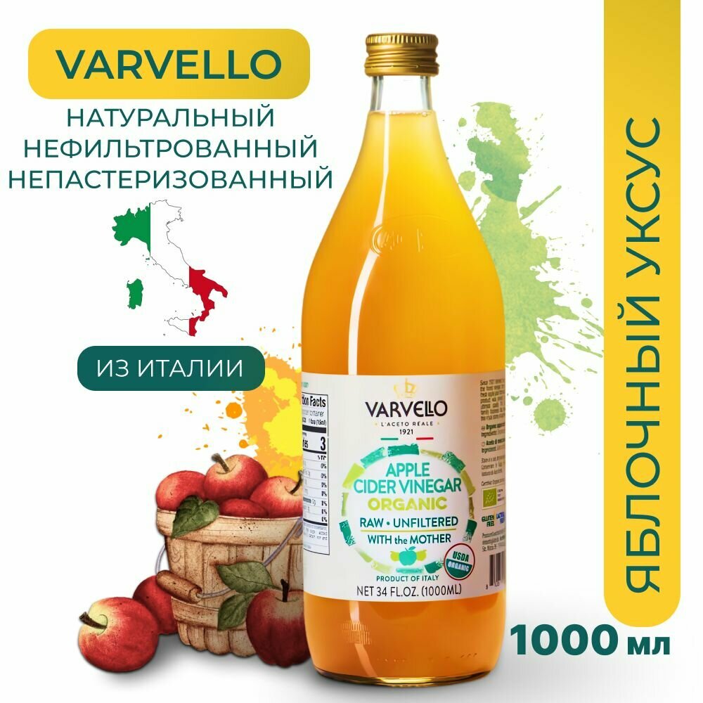 Яблочный уксус натуральный, 1 литр, нефильтрованный, непастеризованный, в стекле, Varvello