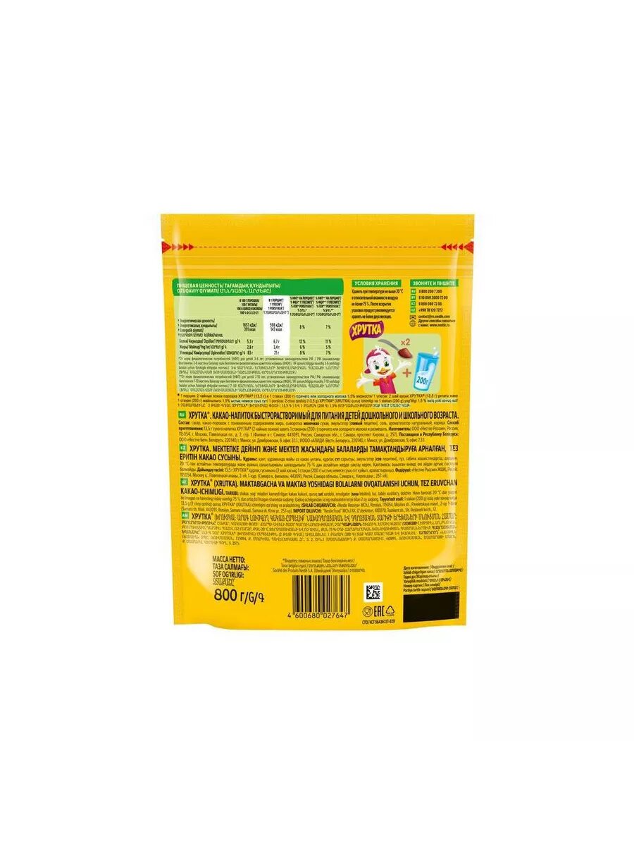 ХРУТКА. Пакет 800г. Какао-напиток быстрорастворимый для питания детей дошкольного и школьного возраста.