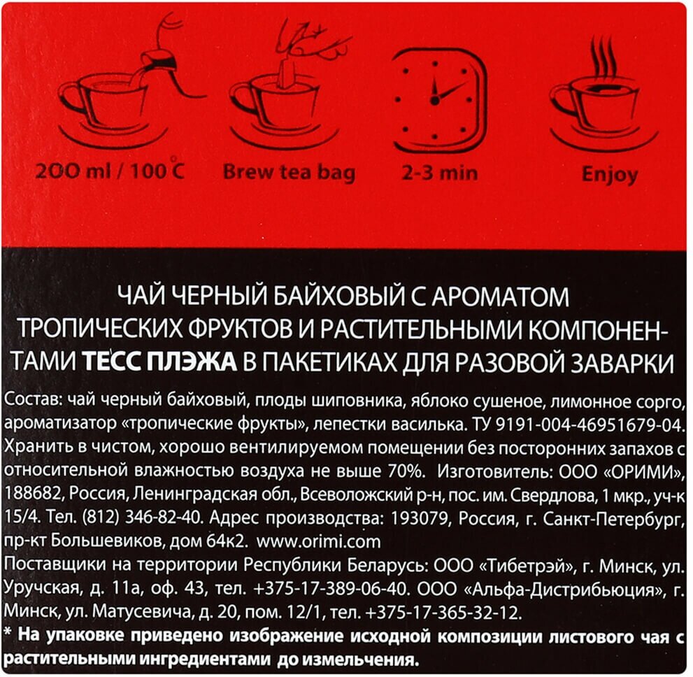 | Способ приготовления | пакетик с чаем залить 200 мл кипятка, заваривать 2-3 минуты |