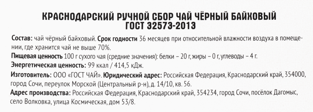 Купить Чай черный краснодарский ГОСТ ЧАЙ ручной сбор листовой, 100г