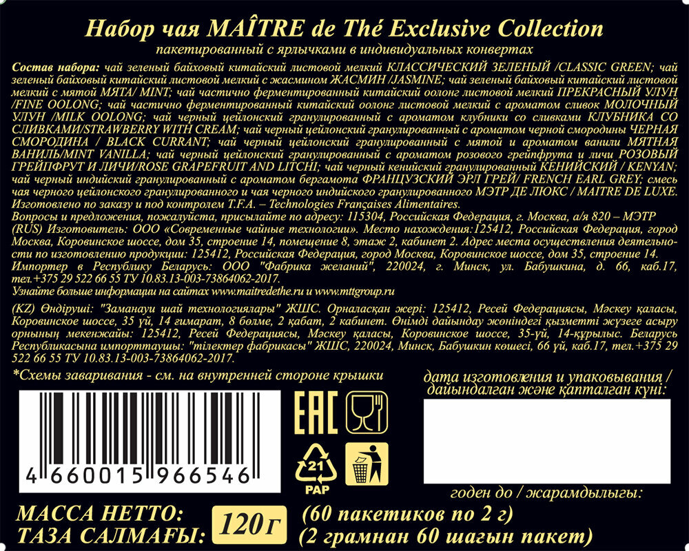 Набор чая MAITRE DE THE ассорти в пакетиках "Эксклюзивная коллекция" , 120 г, 60 шт подарочная упаковка мэтр