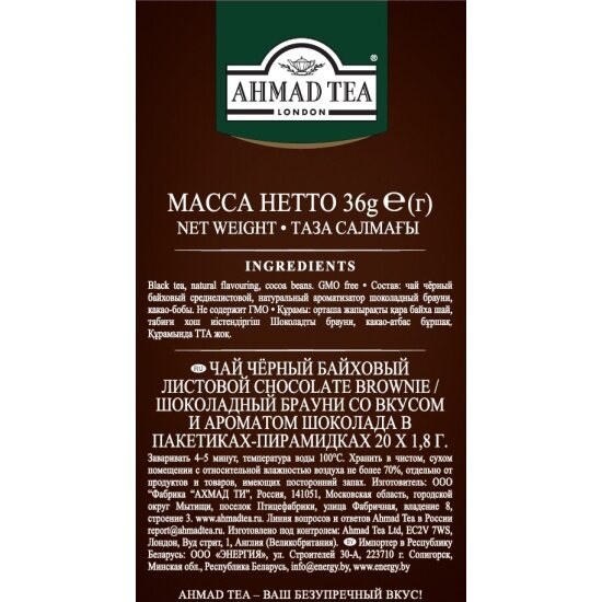 Чай "Ahmad Tea" Шоколадный брауни, черный, листовой, пирамидки, 20х1,8г интересное: