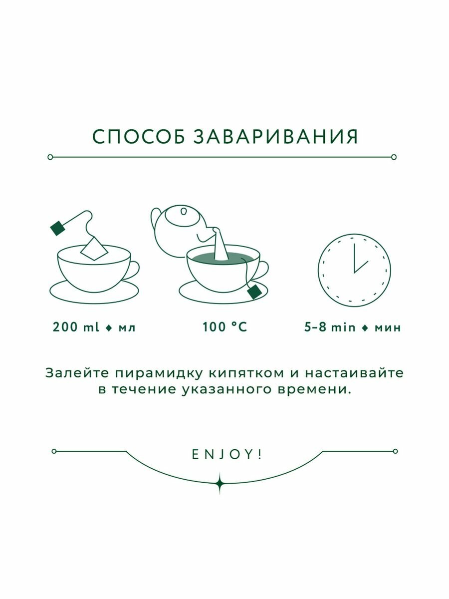 | Способ приготовления | Положить в заварочный чайник или чашку по одному пакетику на человека. Залить кипятком и настаивать 2-3 минуты. |