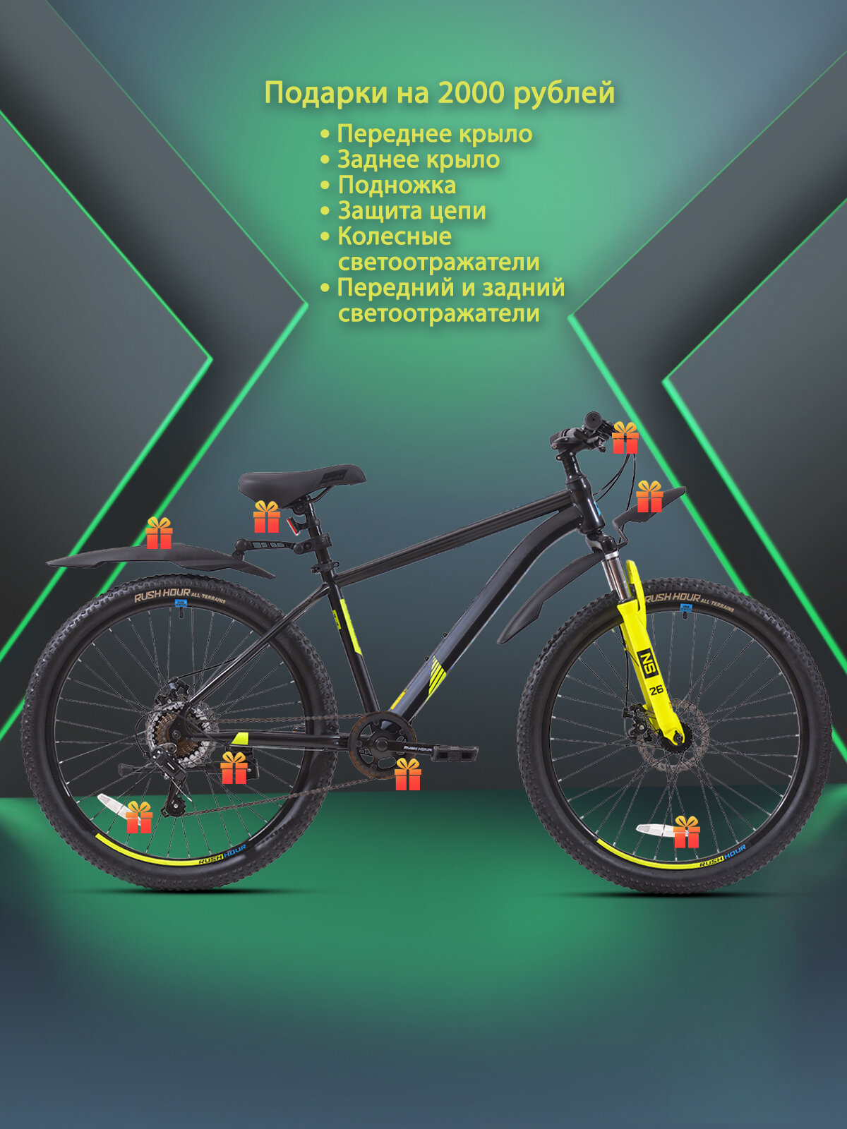 Купить Велосипед горный дисковый 26" рост 140-155см 7 скоростей черный рама 14" . велик 8 лет 9 лет 10 лет переключатель SHIMANO скоростной RUSH HOUR NX 605