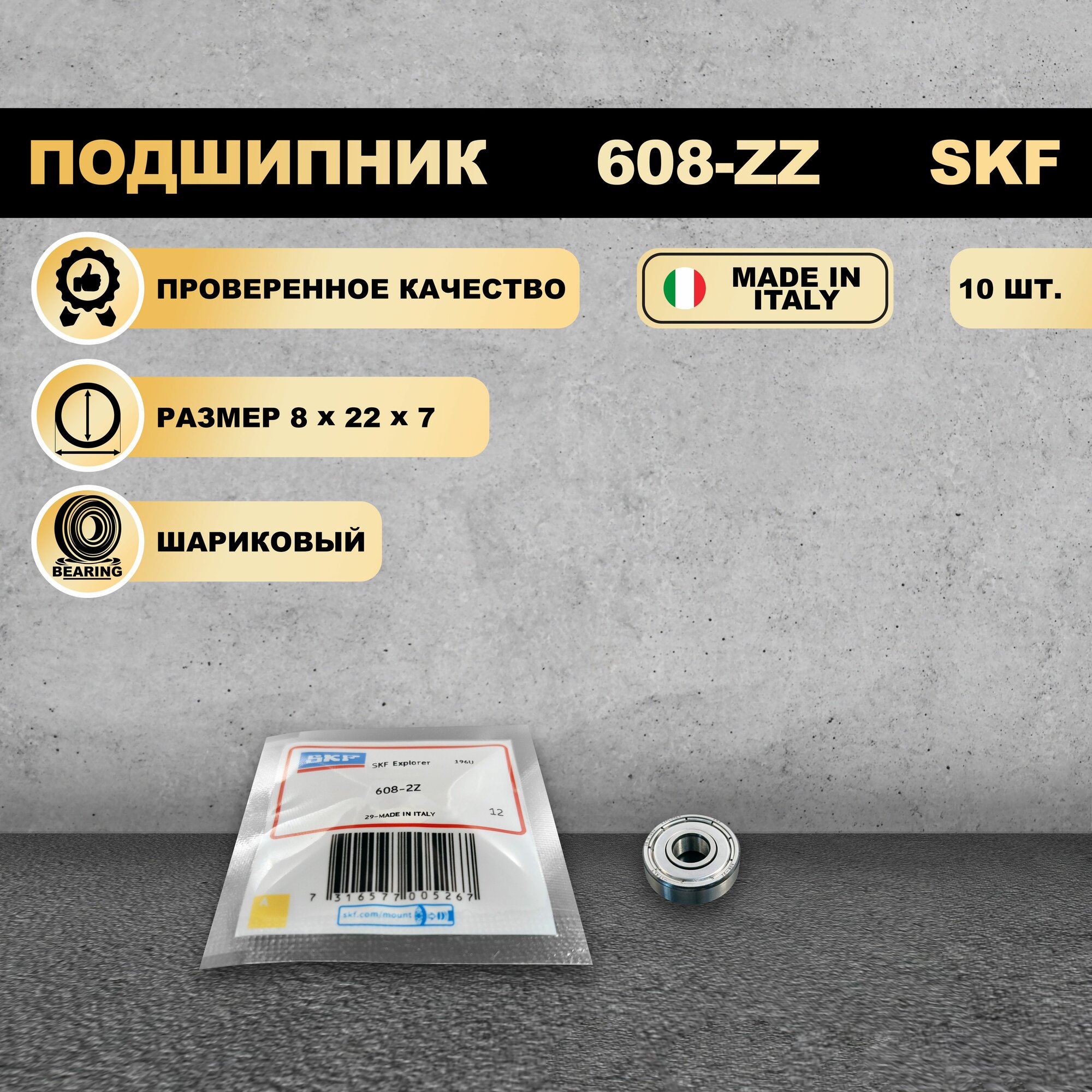 Купить Комплект из 10 шт. Подшипник 608-2Z (608-ZZ) (80018) SKF Швеция. Made in italy. Для самокатов, роликов, скейтбордов и т.п. ABEC-7