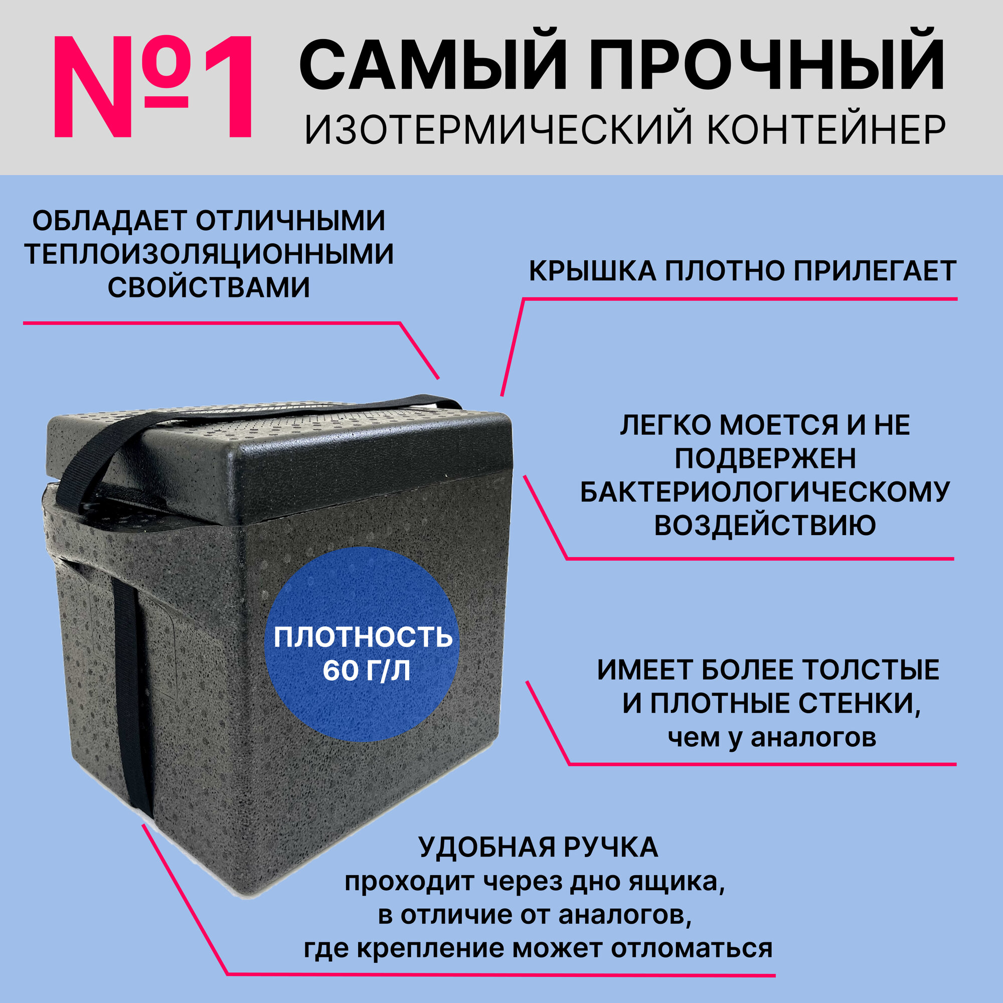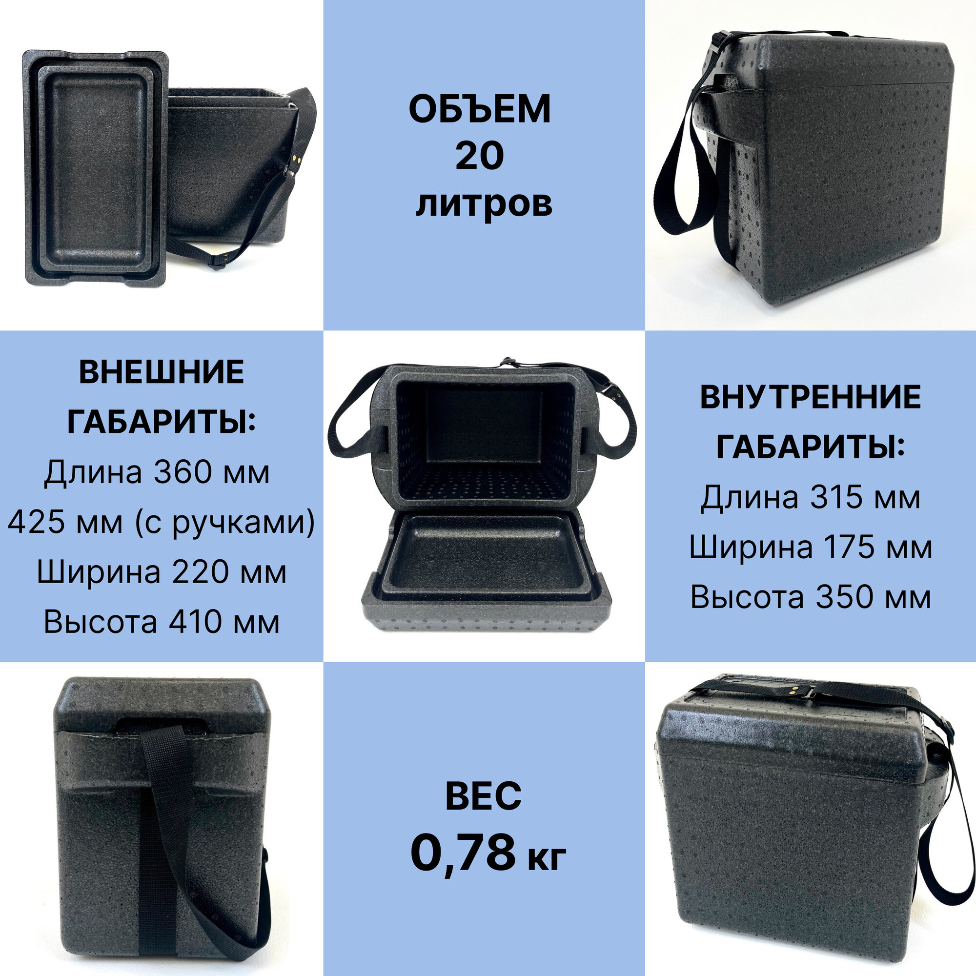 | Дополнительная информация | Крышка имеет плотный прижим, дополнительно может быть укомплектован ручками для переноса (продается отдельно); максимальная нагрузка: 50 кг; принцип охлаждения: требуется аккумулятор охлаждения |