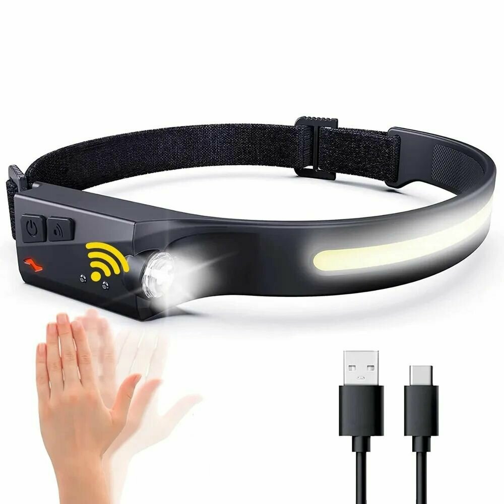 Налобный светодиодный фонарь с магнитом, регулировкой угла свечения и диммированием COB светильника, cо встроенным аккумулятором и зарядом от USB, кабель USB и АКБ в комплекте.
