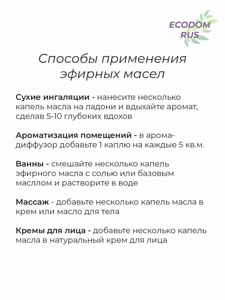 | Способ применения | При дискомфорте кожного покрова нанесите 1-2 капли масла на пораженный участок. Для улучшения очищающих свойств косметического молочка добавьте в него одну каплю масла или нанесите масло на лицо после бритья. Для очистки и поддержания здоровья ногтей нанесите на них масло после принятия душа. Для защиты от негативного воздействия окружающей среды добавьте несколько капель в бутылку-распылитель с водой и с его помощью наносите на поверхности. |