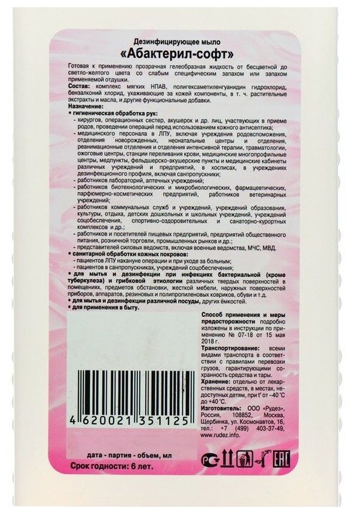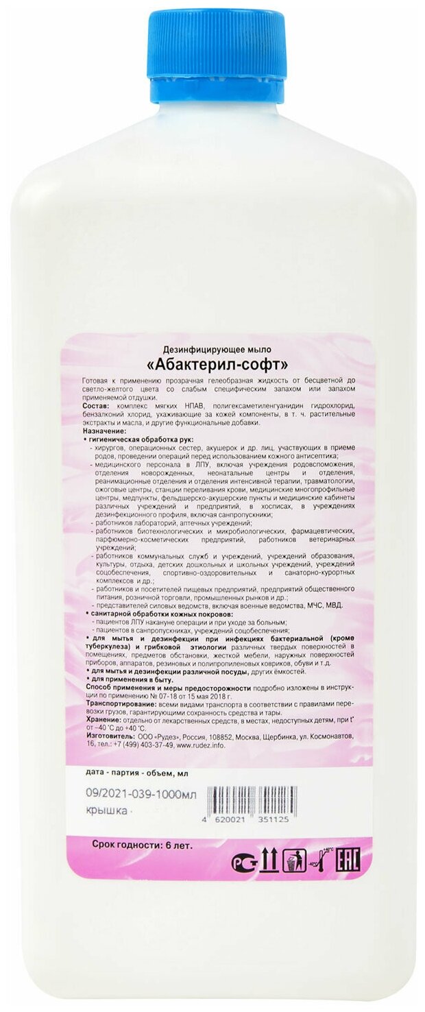19 шт. Абактерил-Софт, дезинфицирующее мыло 1 л. ГОСТ 12.1.007-76