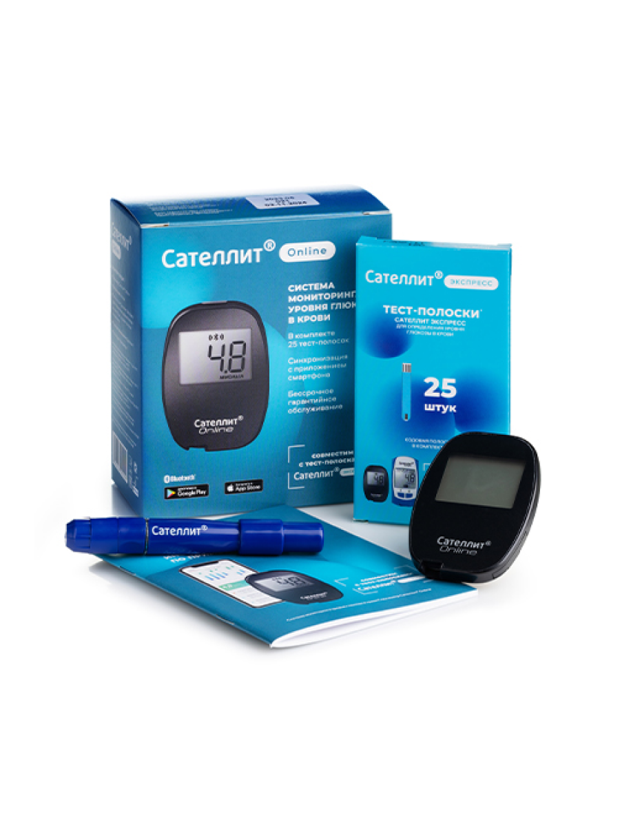 Глюкометр Сателлит Online (Онлайн) + тест-полоски Экспресс (25 шт.) + ручка-прокалыватель в наборе, измеритель сахара в крови