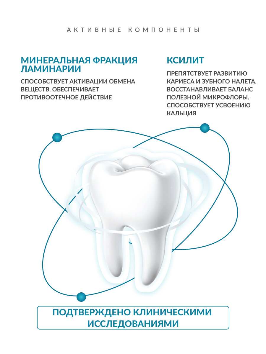 | Эффект | антибактериальный эффект, защита от кариеса, нормализация состава микрофлоры, отбеливание, противовоспалительный, свежее дыхание, снижение чувствительности зубов, удаление зубного налета, укрепление десен, укрепление эмали |