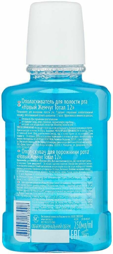 | Дополнительная информация | Ополаскиватель для полости рта Новый жемчуг Тотал 12, 500 мл. Ополаскиватель укрепляет десны, освежает дыхание, оказывает профилактику кариеса, препятствует образованию налёта. Осуществляет комплексный уход за полостью рта даже в тех случаях, когда использование зубной пасты невозможно. Предварительная чистка зубов пастой усиливает действие ополаскивателя. Комплекс натуральных экстрактов ромашки, календулы, зверобоя, крапивы, мяты, эхинацеи, шалфея предотвращает воспаление и снижает кровоточивость десен. Ополаскиватель безопасен при случайном проглатывании. Не сушит и не раздражает слизистую оболочку полости рта. |