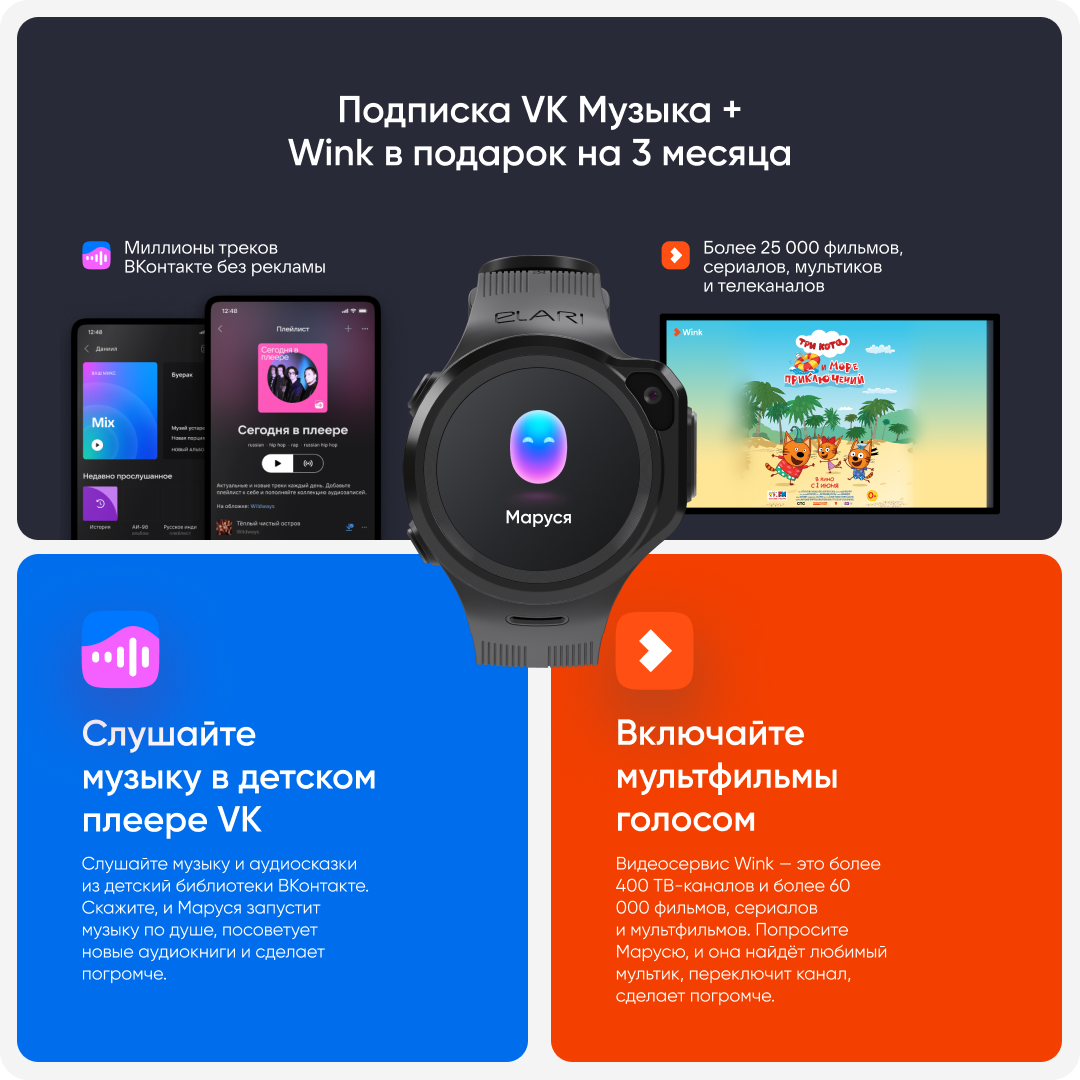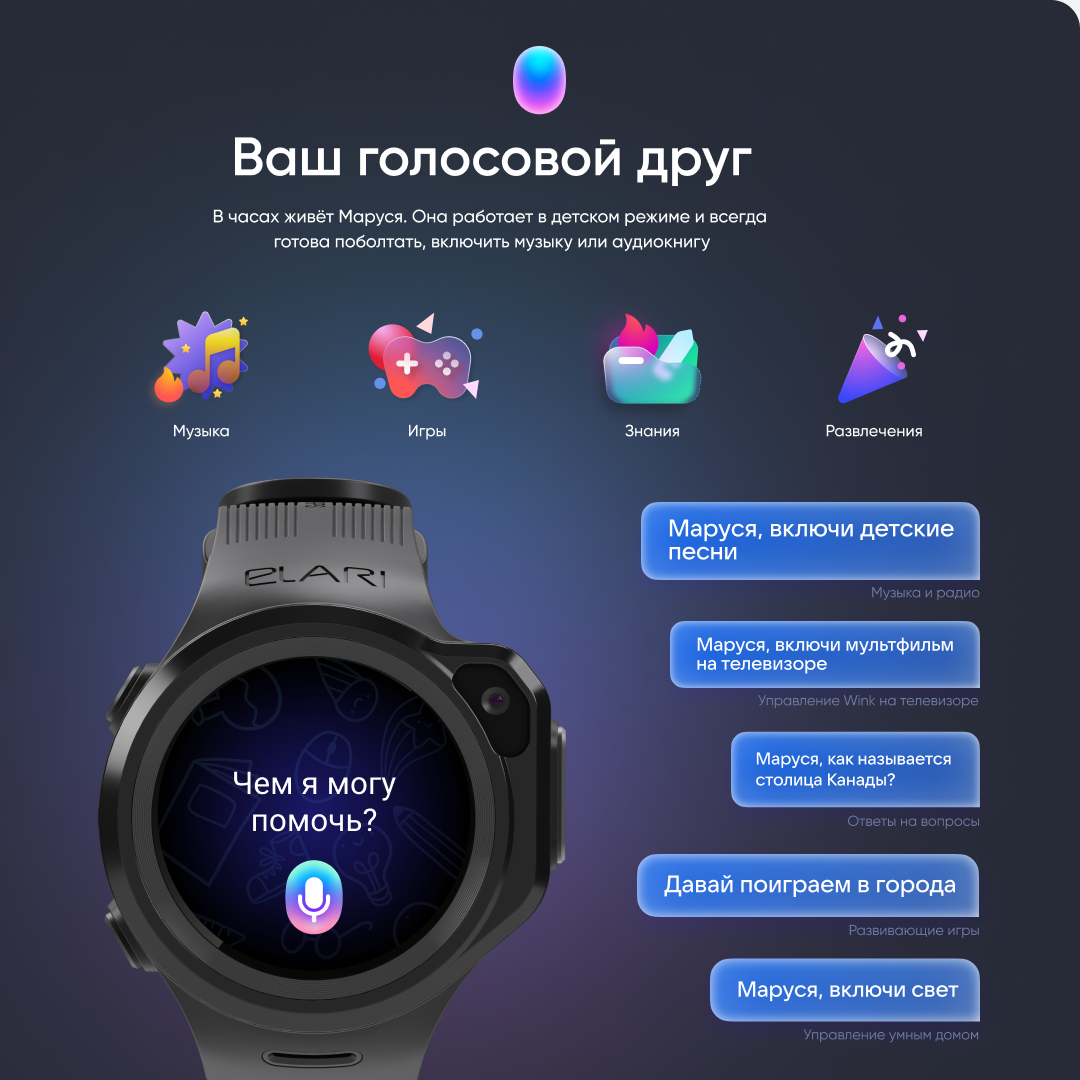 Elari 4GR M детские часы-телефон - черные, 4G, nano-SIM, Маруся, сенсорный дисплей 1.3 IPS 240х240