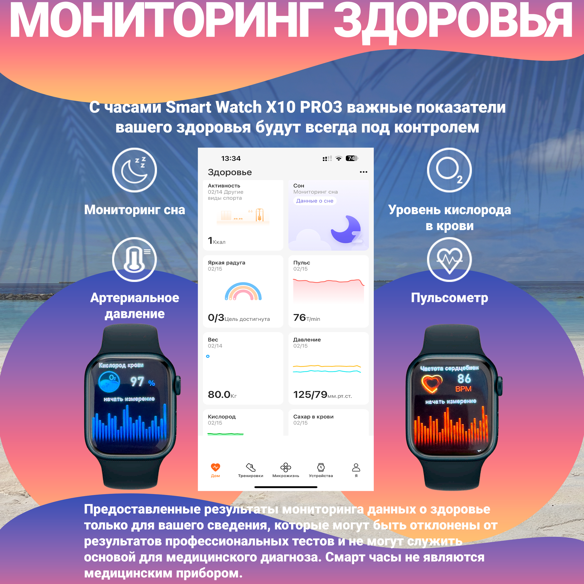 | Мониторинг | ЭКГ, калорий, пульса, сна, уровня кислорода в крови, физической активности, частоты дыхания |