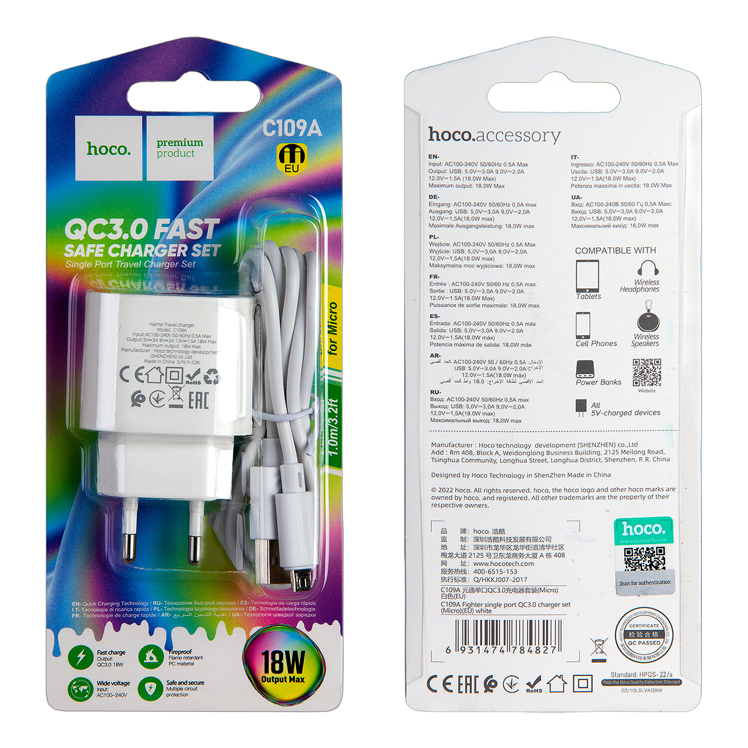 Купить Сетевое зарядное устройство Hoco C109A, 1 USB, 18 Вт, QC, кабель micro USB - USB, 1 м, белое