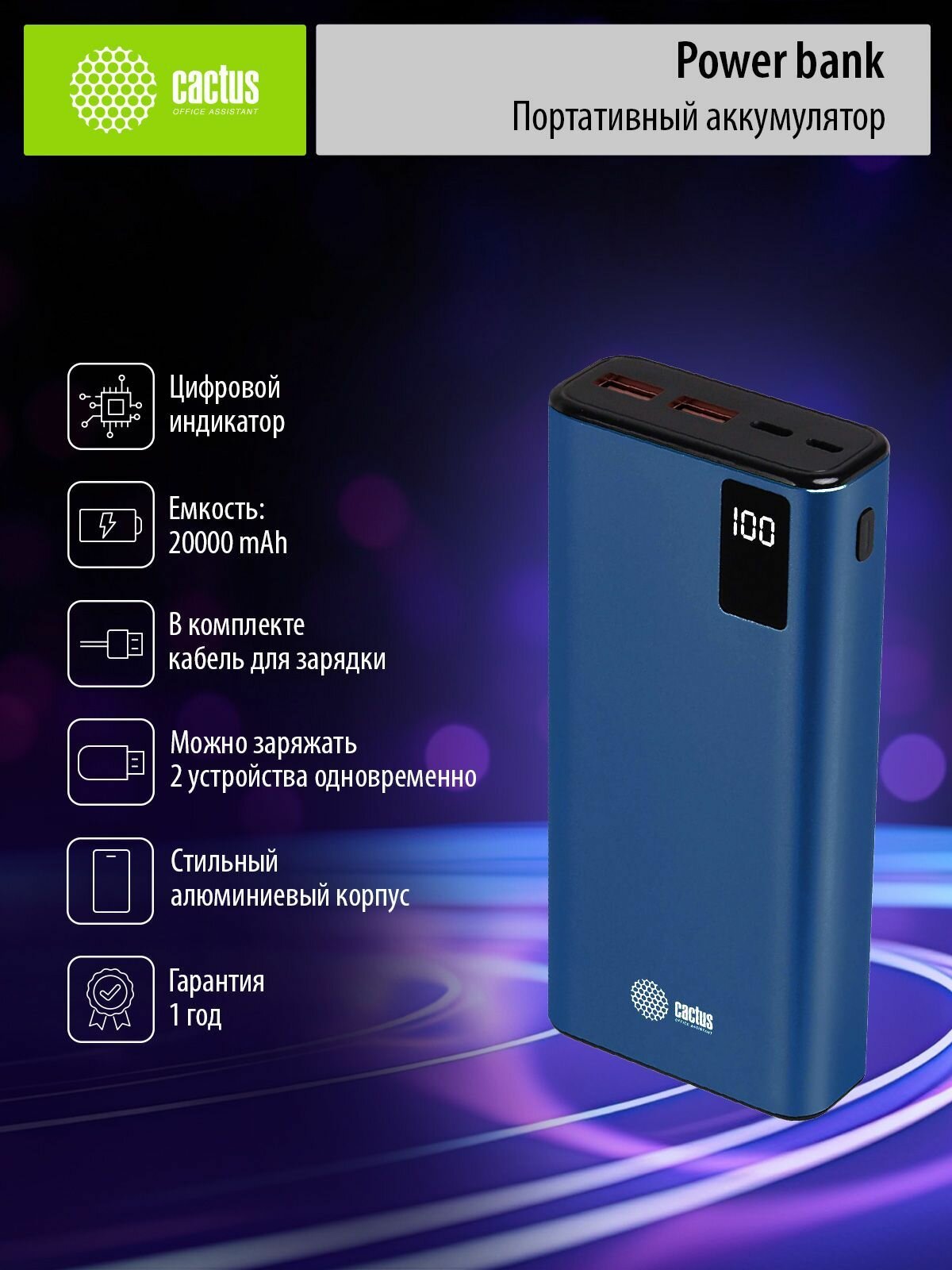 Портативный аккумулятор Cactus CS-PBFSYT-20000 20000mAh 3A 2xUSB синий . интересное: