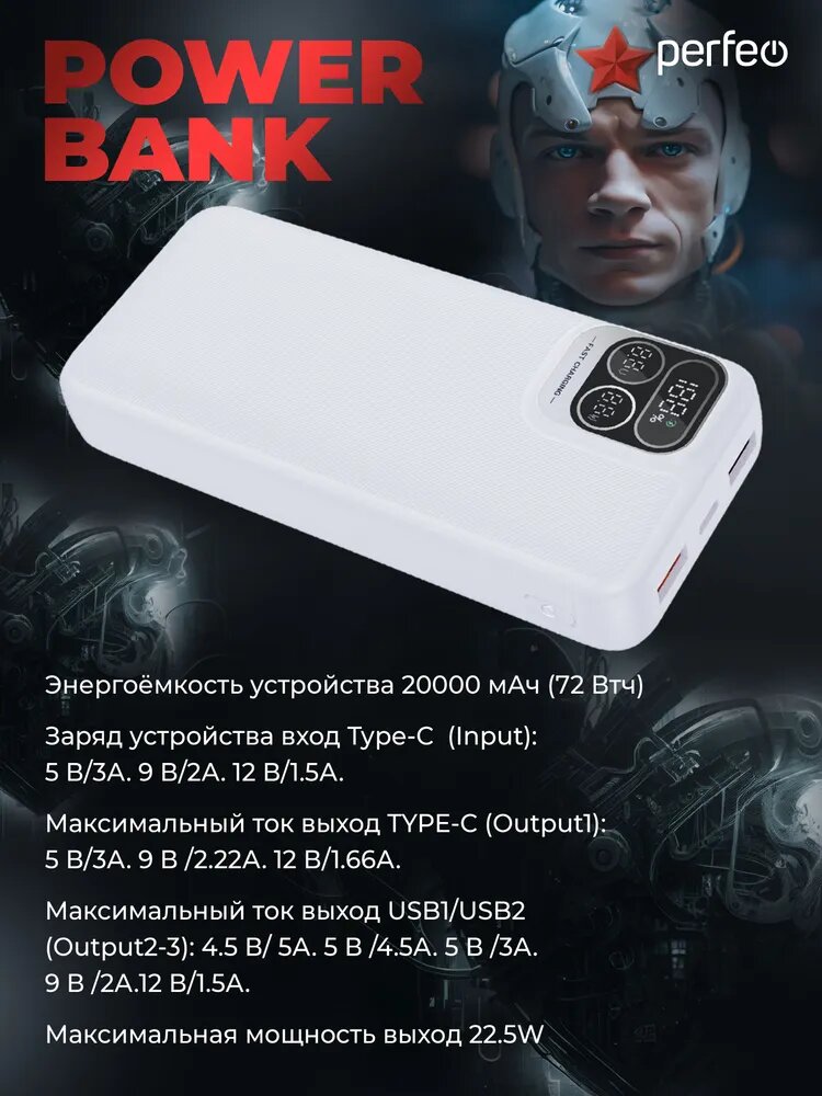 Аккумулятор PERFEO "Atomic Age", LED-дисплей, PD+QC 3.0, Type-C, 2 USB, 20000 мАч, белый