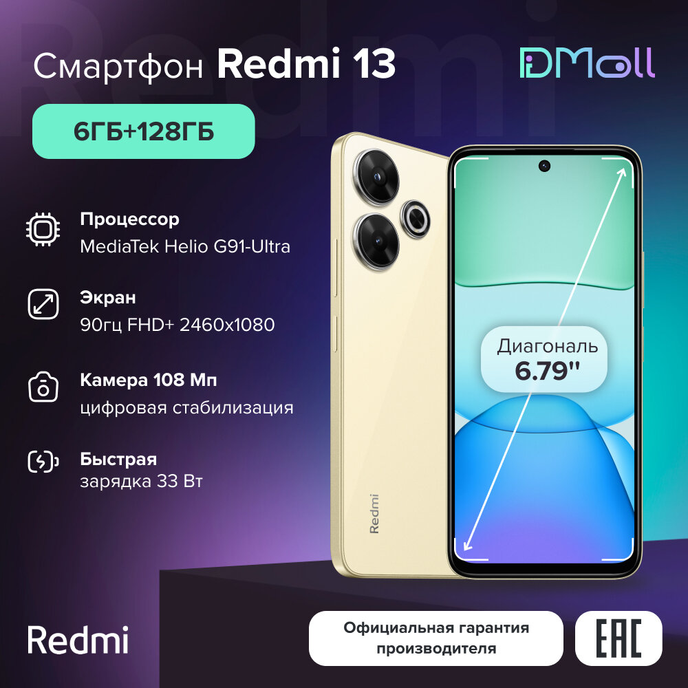 Смартфон Xiaomi Redmi 13 6/128 ГБ Gold, экран 6,79, Ростест, золотой
