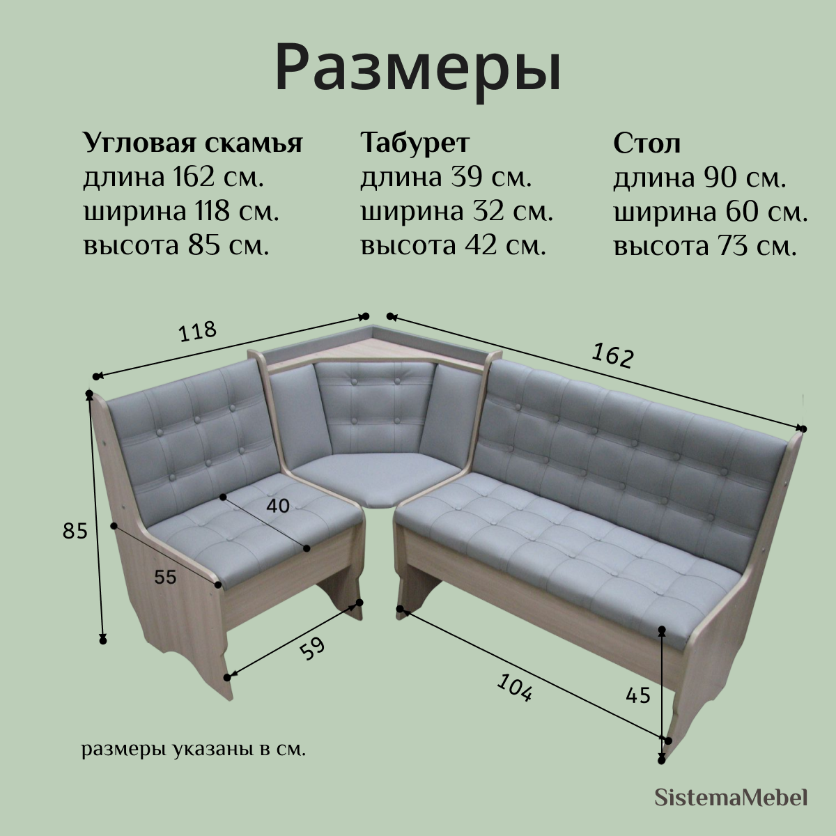 | Габариты | угловая скамья ДхШхВ 162х118х85 см. |