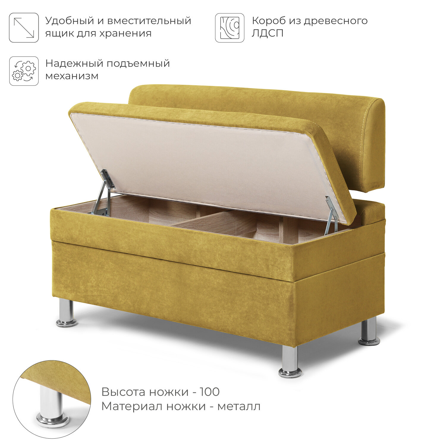 Диван на кухню, прямой, на балкон, в прихожую норта Hippo 1200х490х770 c ящиком для хранения, горчичный